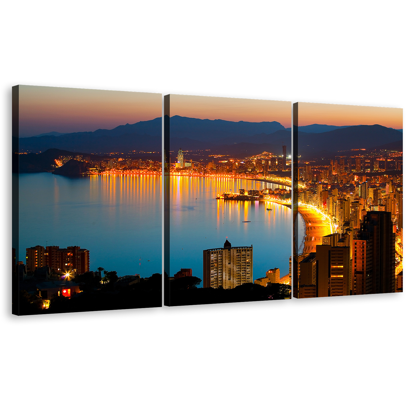 Glowing Coastline Wall Art, Yellow Benidorm City Beach Triptych Canvas Print, Amazing Blue Night City Beach Multi Canvas Canvas Print