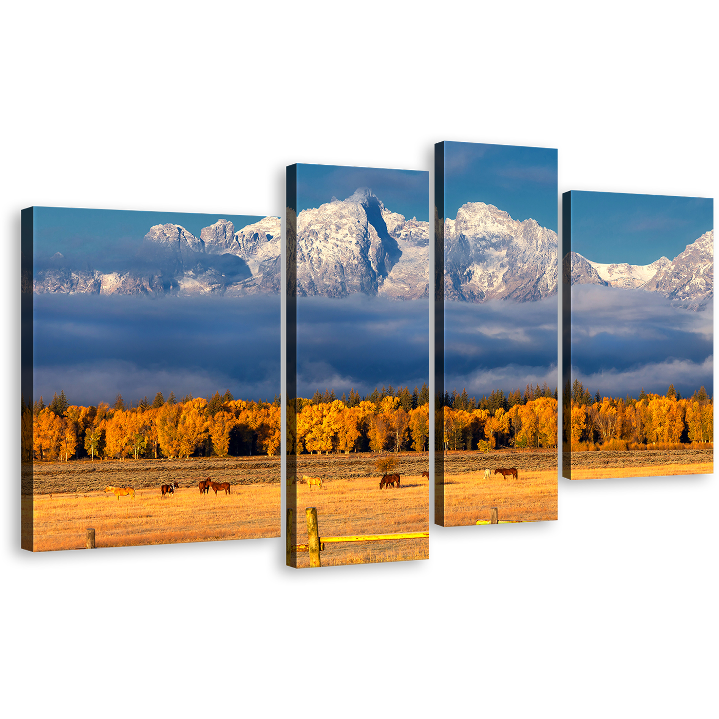 Autumn Landscape Canvas Wall Art, Orange Grand Tetons Autumn Foliage 4 Piece Canvas Print, Blue Cloudy Sky Snow Mountains Multi Canvas Canvas Print