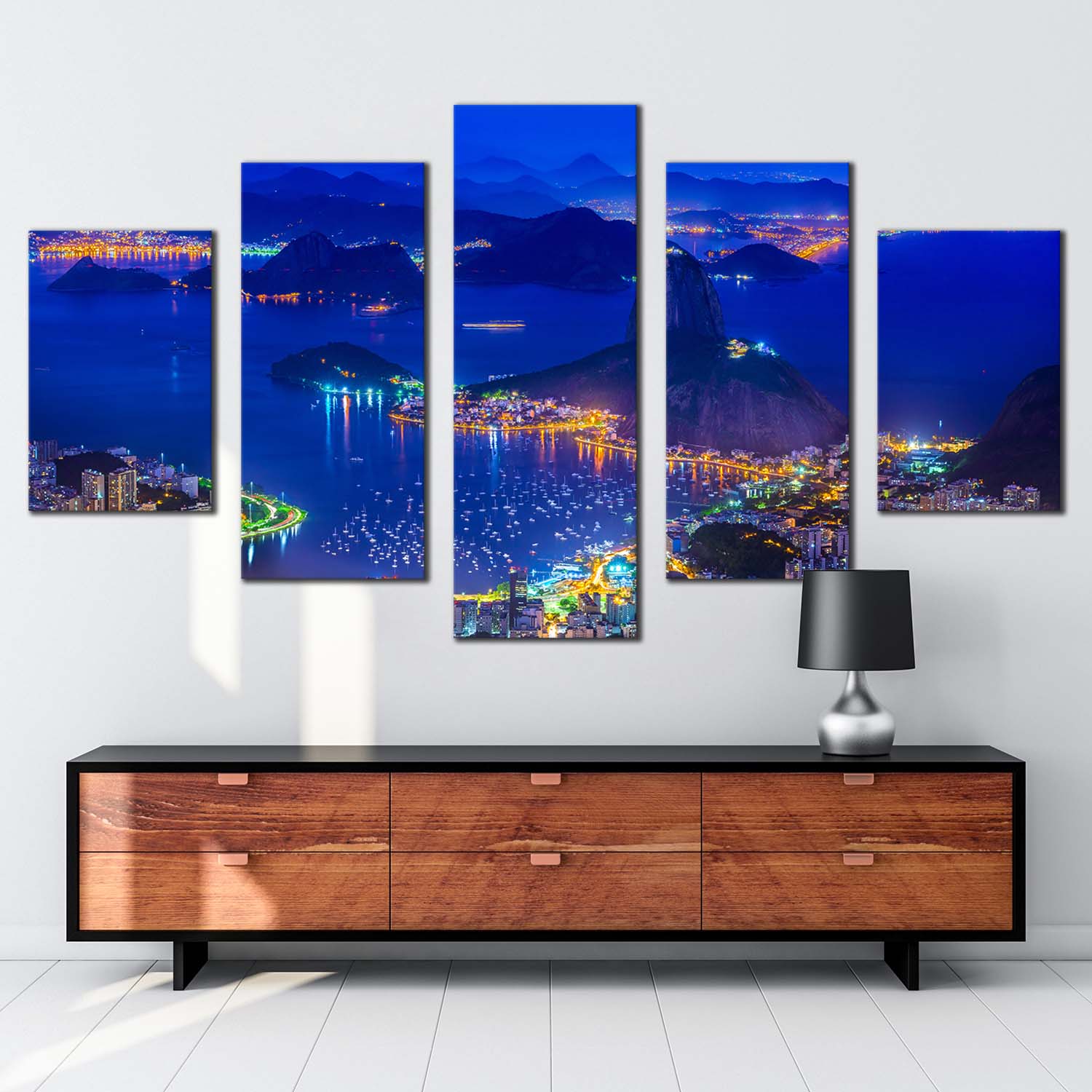 Brazil Cityscape Canvas Print, Yellow City Mountains 5 Piece Canvas Wall Art, Blue Sugarloaf Mountain Skyline Canvas Set Canvas Print