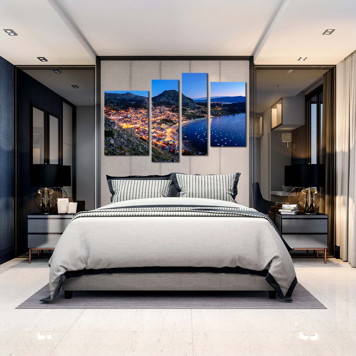 City Beach Canvas Wall Art, Copacabana Evening Green Mountain City Canvas Print, Blue Lake Titicaca 4 Piece Multiple Canvas Canvas Print