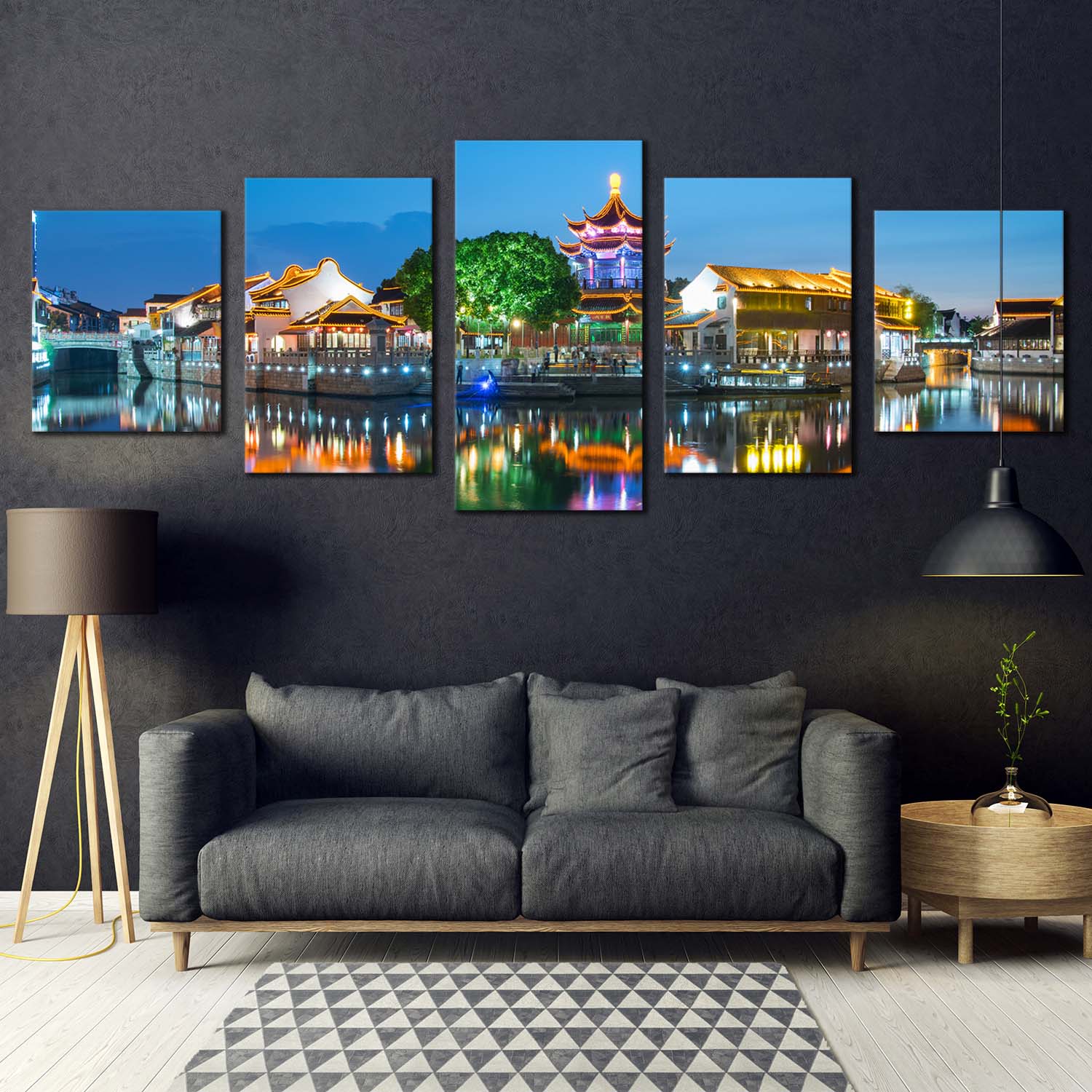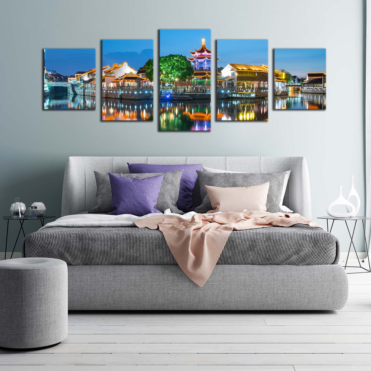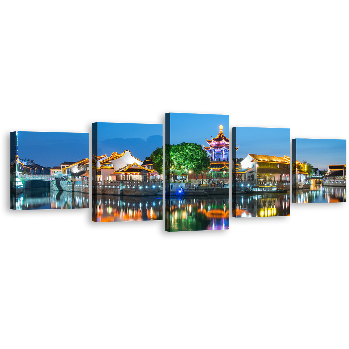 City View Canvas Wall Art, City Landscape Multi Canvas Artwork, Colorful City Lights Water Reflection 5 Piece Canvas Print Canvas Print