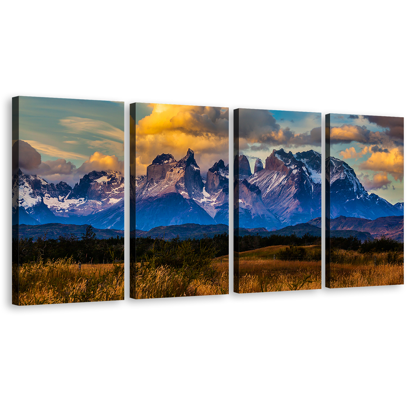 Cuernos Mountain Wall Art, Green Landscape Torres del Paine National Park Multiple Canvas, Beautiful Blue Mountains Clouds 4 Piece Canvas Set Canvas Print