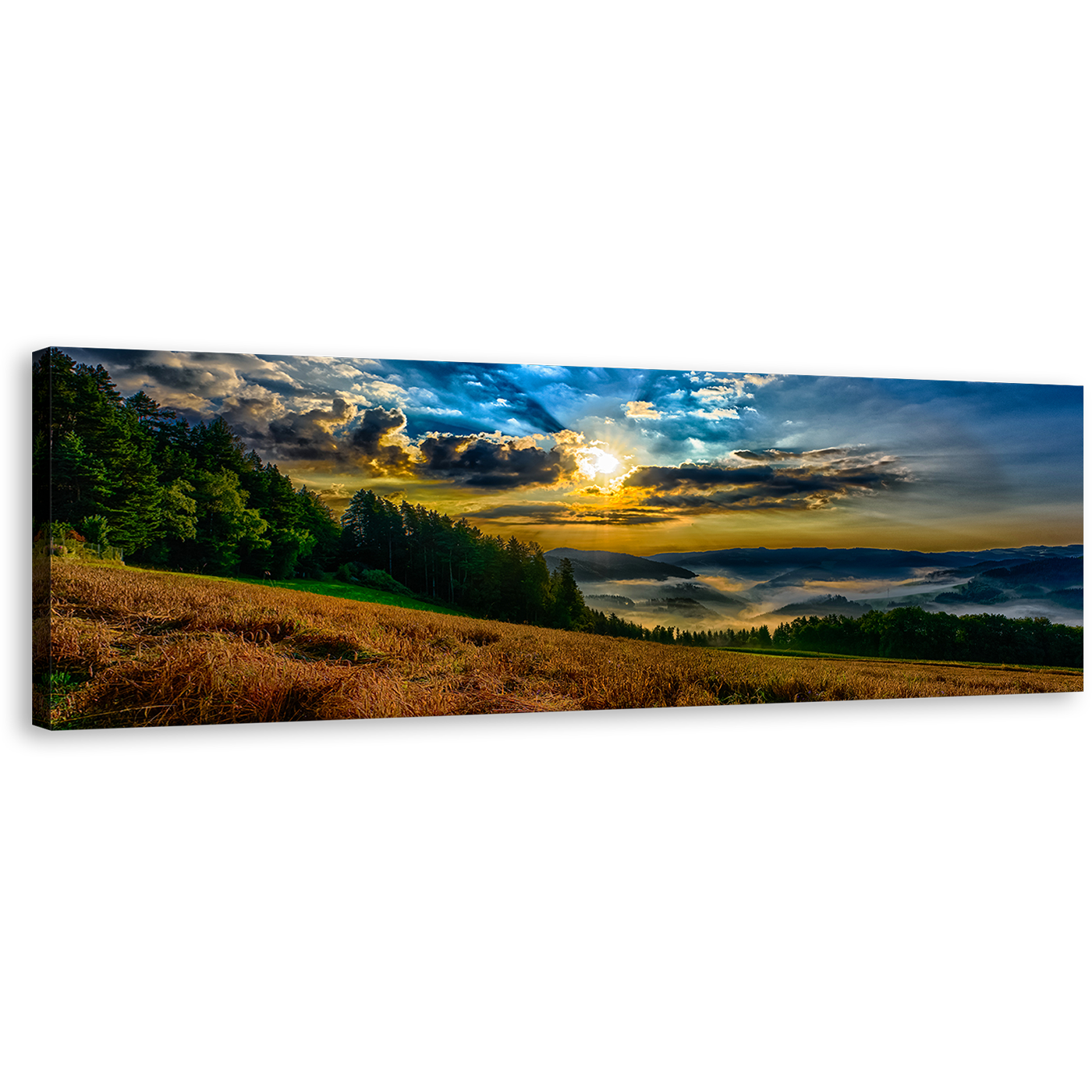 Dramatic Sunrise Canvas Print, Yellow Sky Landscape Valley 1 Piece Canvas Wall Art, Blue Clouds Landscape Scenery Wide Canvas Canvas Print