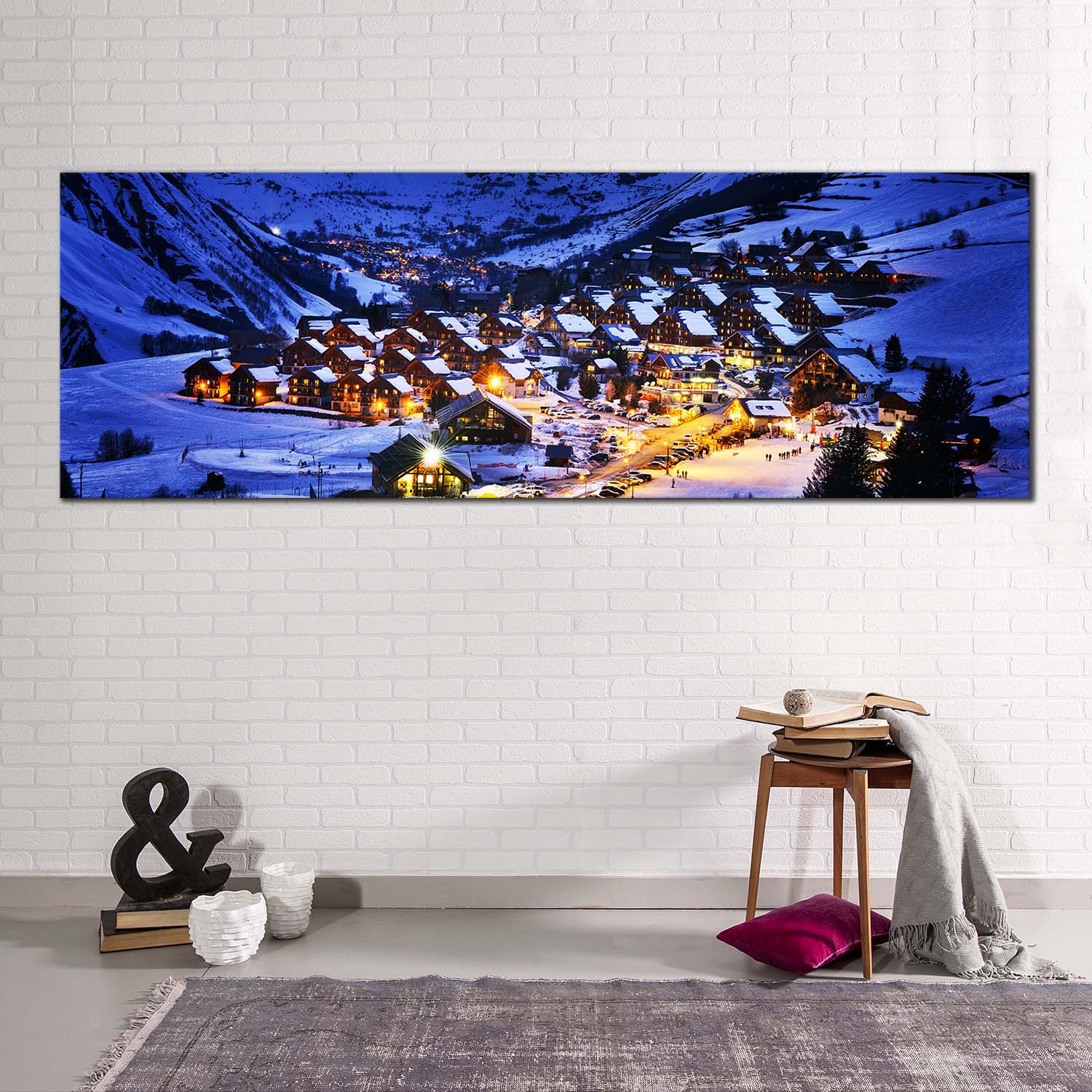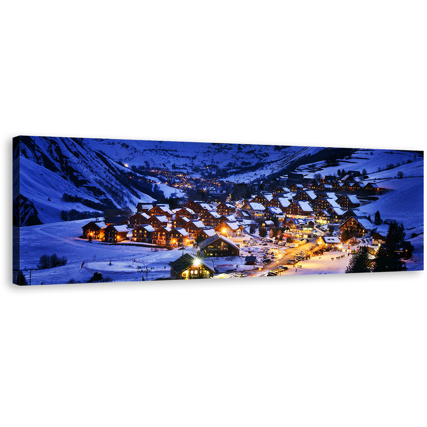 Evening Landscape Canvas Wall Art, Yellow Lights Ski Resort 1 Piece Canvas Artwork, Saint jean d'Arves Blue Mountain Canvas Print Canvas Print