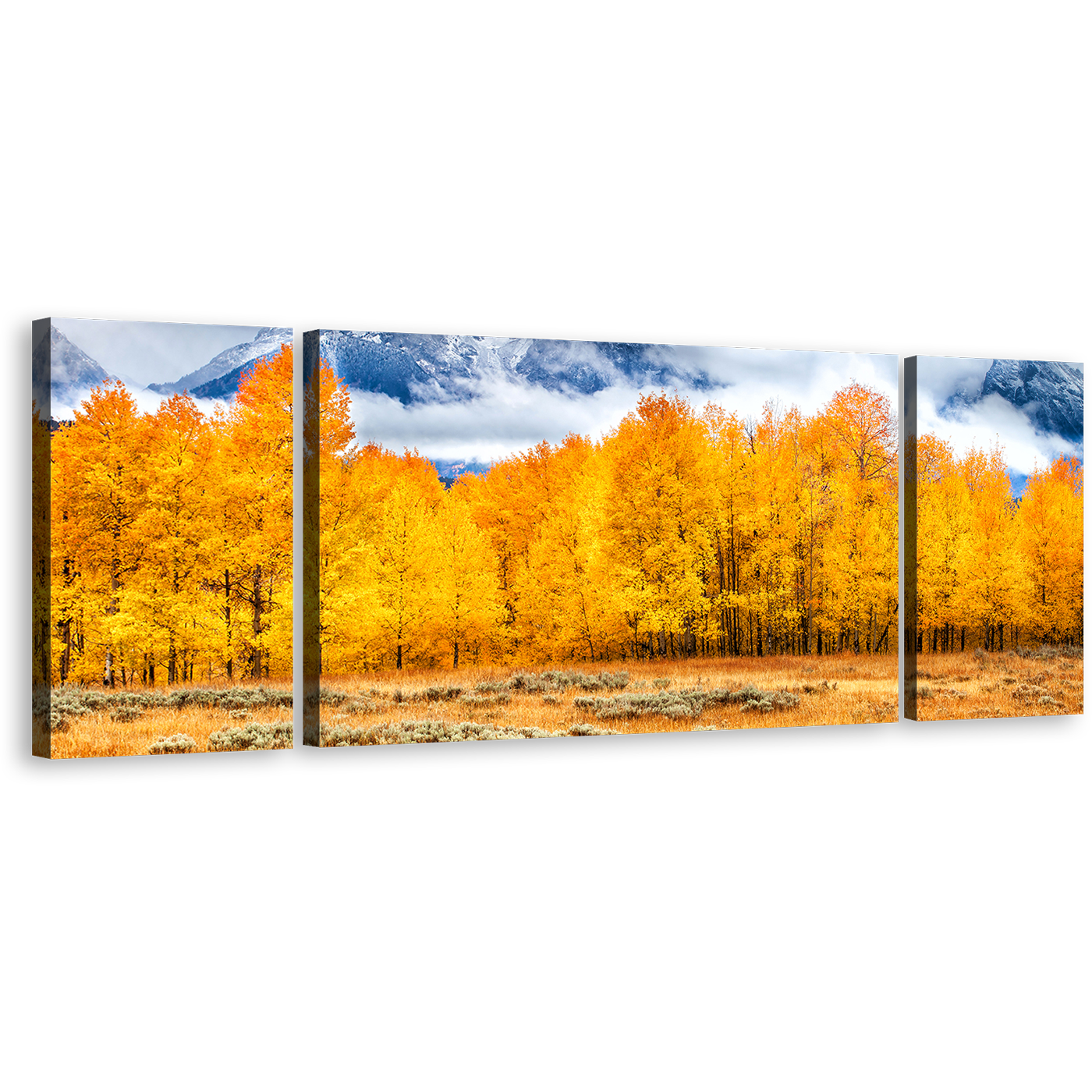 Grand Tetons Wall Art, White Clouds Covered Mountain Canvas Set, Orange Autumn Trees Landscape 3 Piece Canvas Print Canvas Print