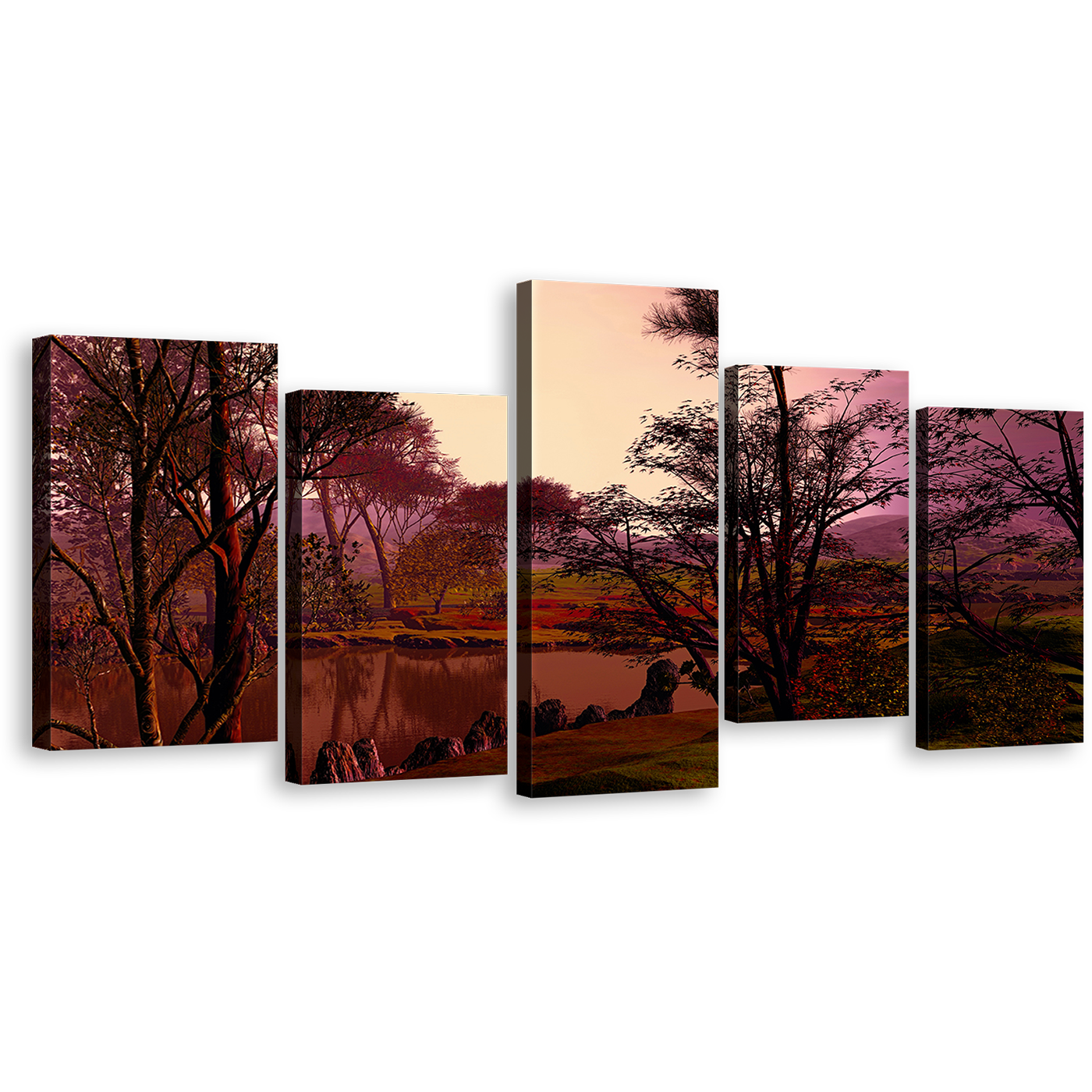 Autumn Scenery Canvas Wall Art, Orange Dusk Sky Landscape Canvas Print, Evening Lake Brown Trees 5 Piece Canvas Set Canvas Print