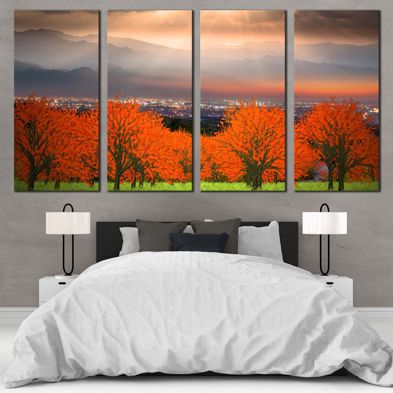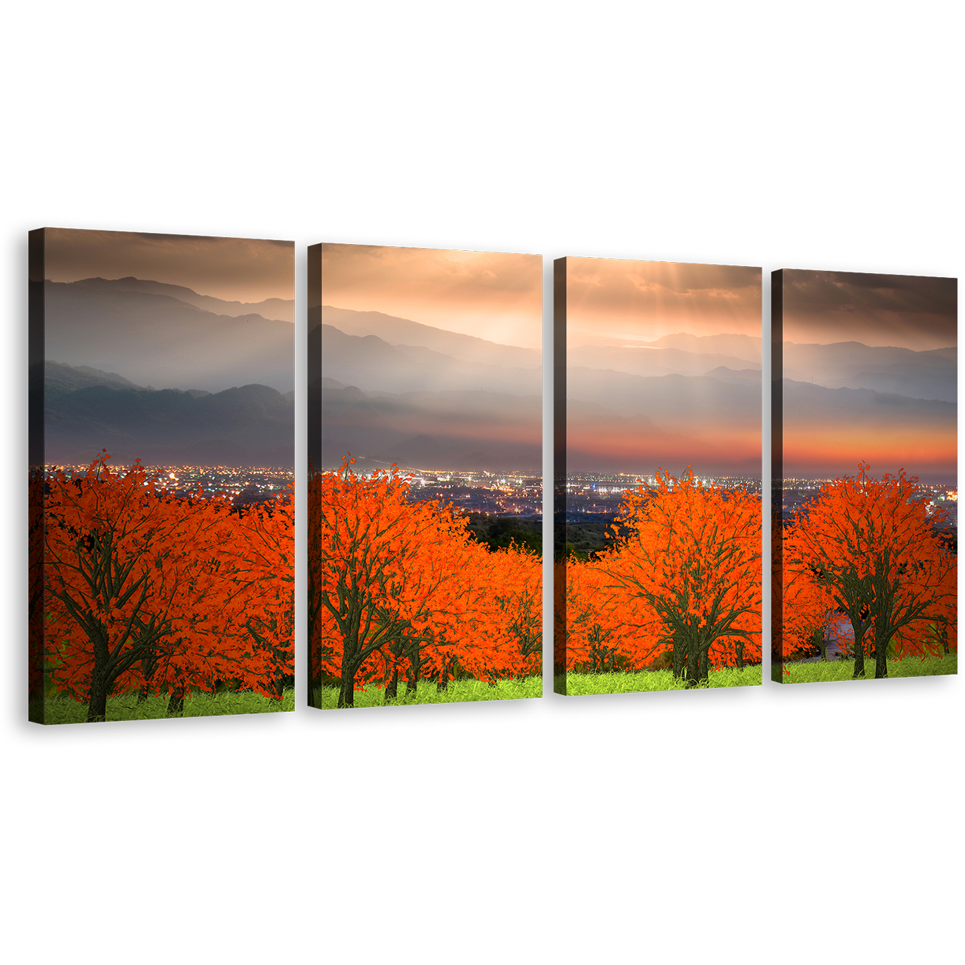 Landscape Scenery Canvas Print, Dramatic Grey Sky Cityscape Multi Canvas, Beautiful Orange Trees Landscape 4 Piece Wall Art Canvas Print