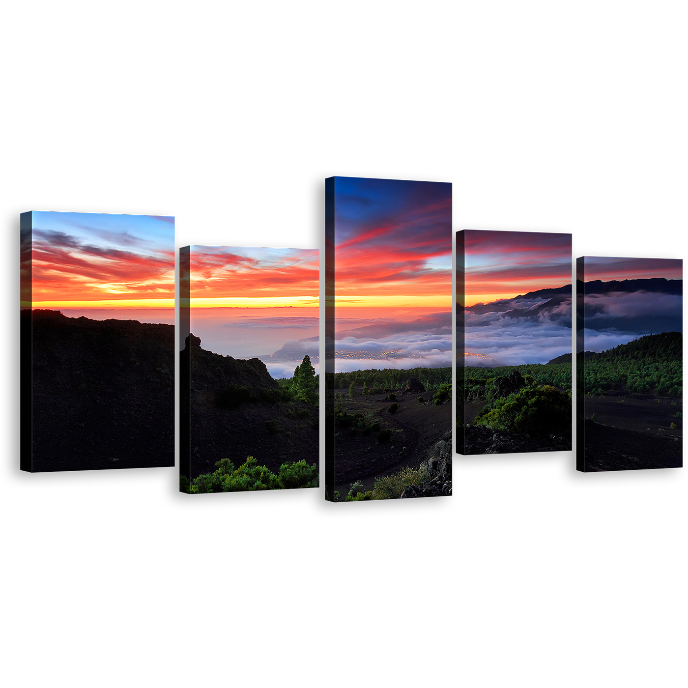 Landscape Sunset Canvas Wall Art, Europe Yellow Cloudy Sunset Mountains Canvas Print, Green La Palma Spain Landscape 5 Piece Canvas Canvas Print