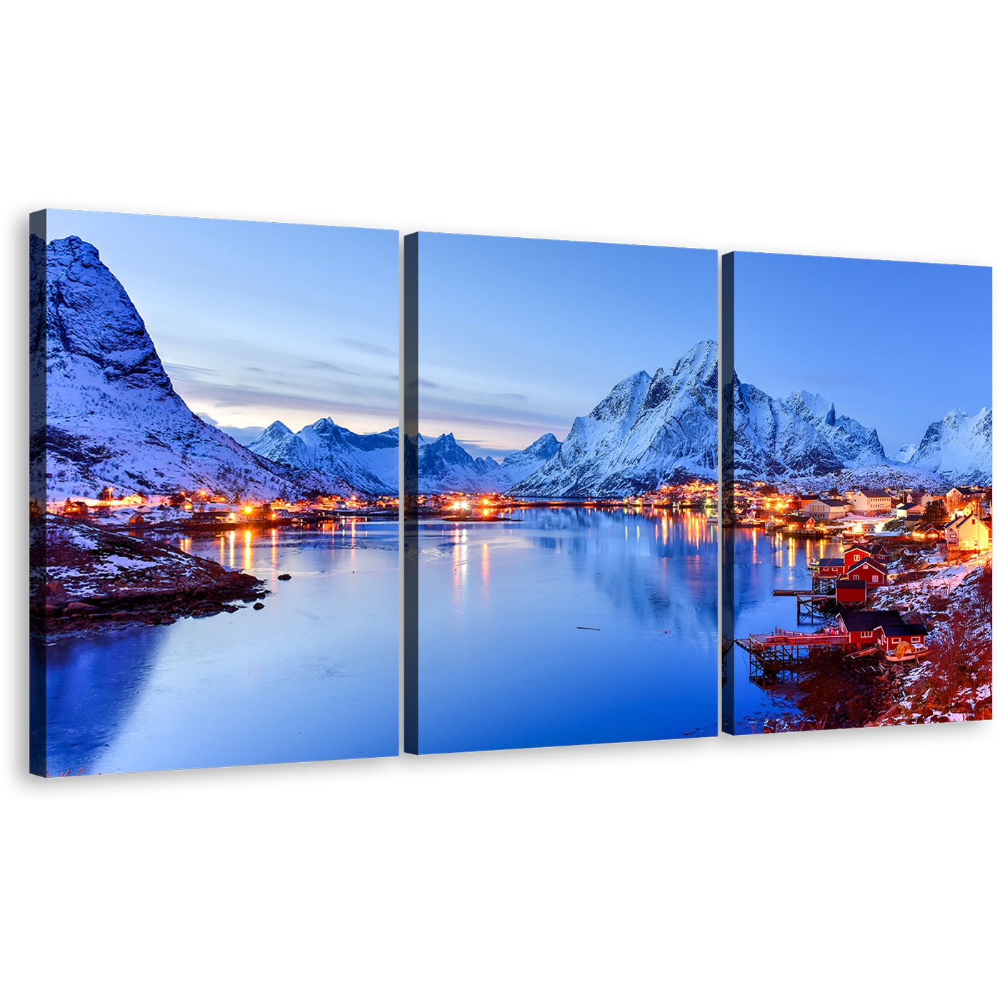 Reine Village Canvas Wall Art, City Mountain Multiple Canvas, Orange Lofoten Islands 3 Piece Canvas Set, Norway Winter Blue Sky Triptych Canvas Print Canvas Print