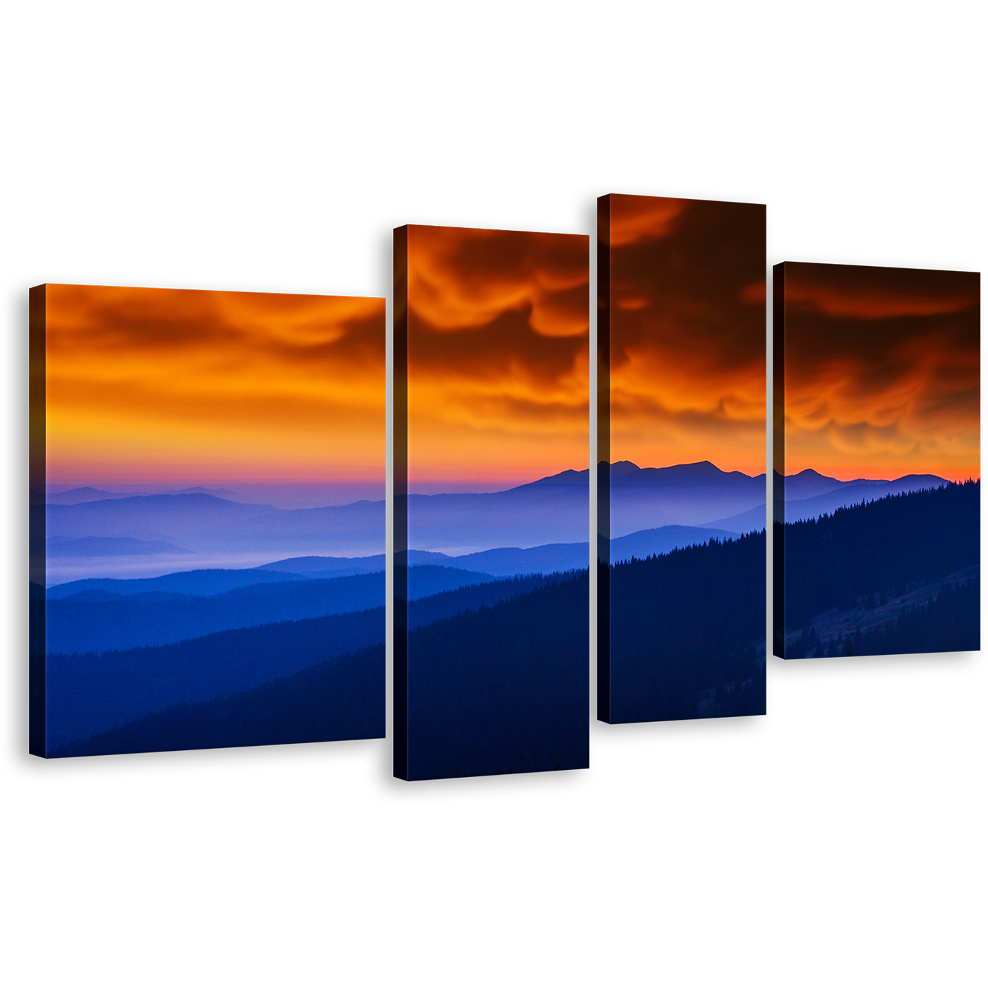 Majestic Mountains Canvas Print, Blue Ukraine Mountains Landscape 4 Piece Canvas Wall Art, Dramatic Orange Cloudy Sky Landscape Multiple Canvas Canvas Print