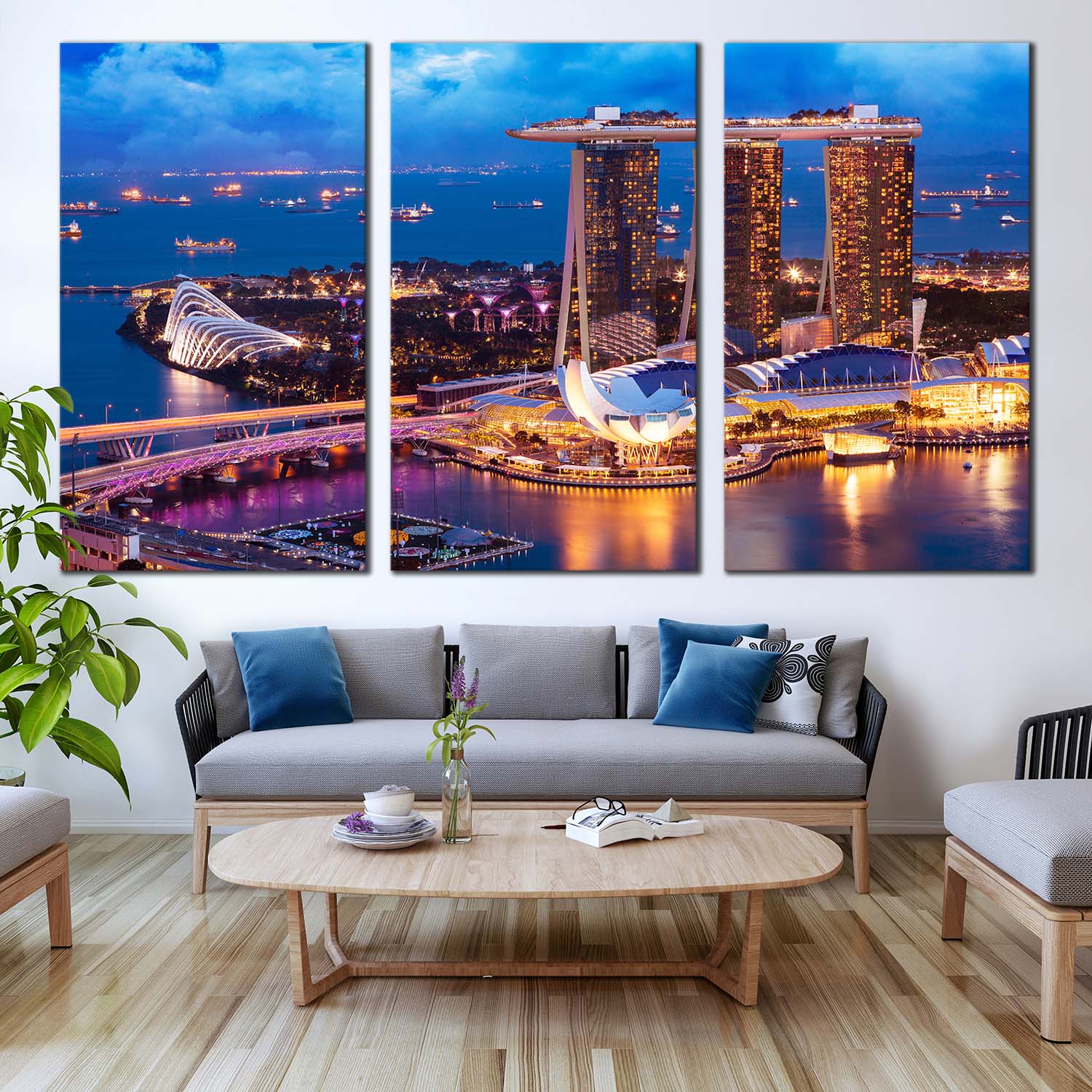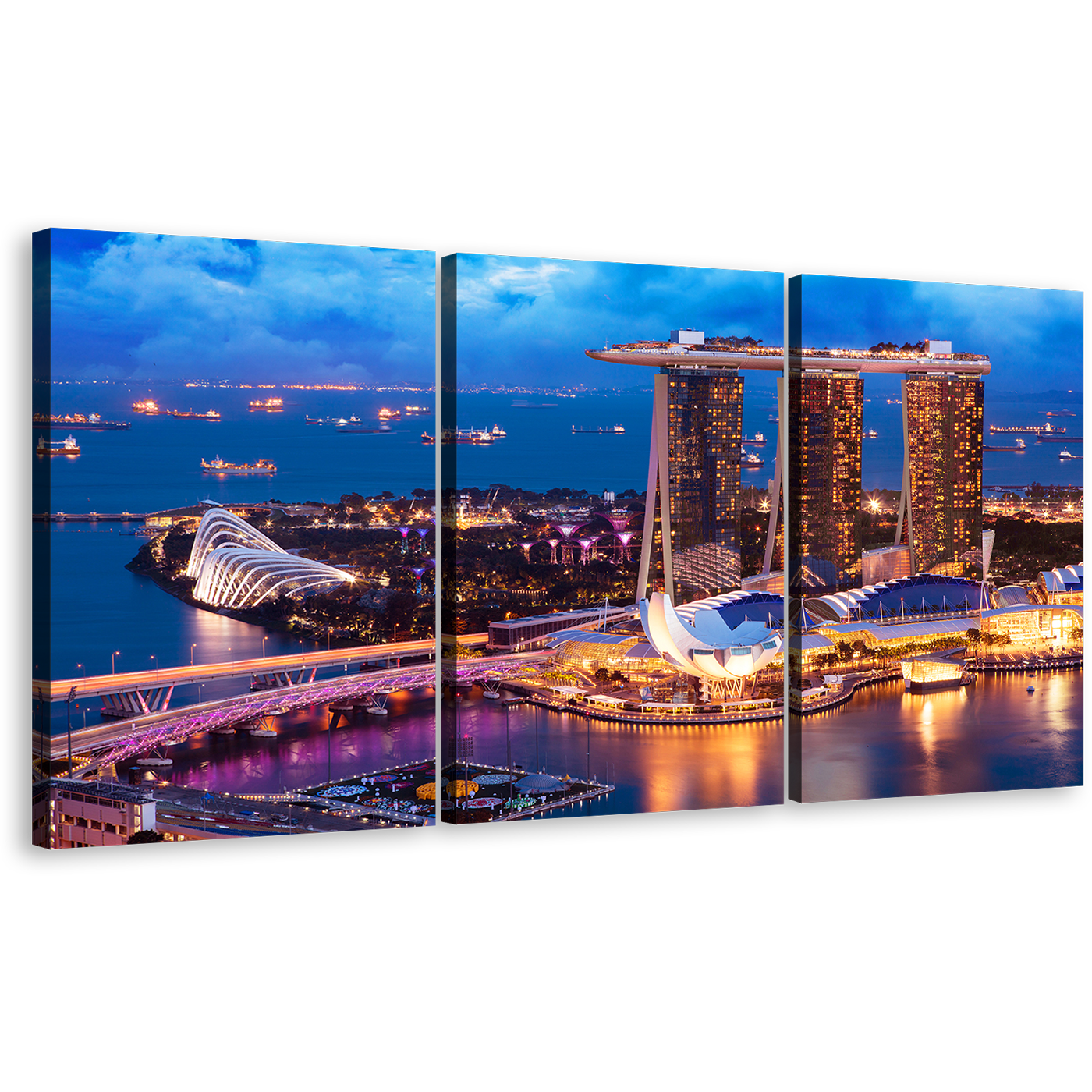 Marina Bay Canvas Print, Yellow Cityscape Lights Ship Triptych Multi Canvas, Blue Singapore Landscape 3 Piece Canvas Wall Art Canvas Print