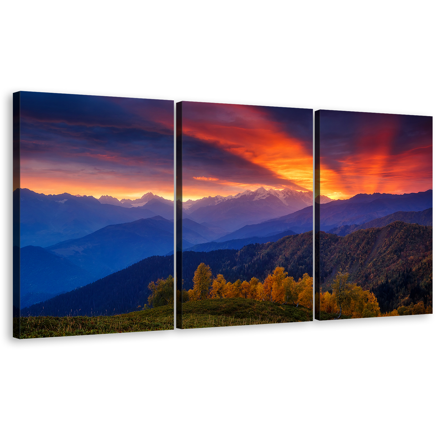 Mestia Landscape Canvas Wall Art, Europe Caucasus Ridge Mt Ushba Canvas Print, Dramatic Orange Sunbeams Sky Canvas Set, Georgia Blue Mountain 3 Piece Canvas Canvas Print