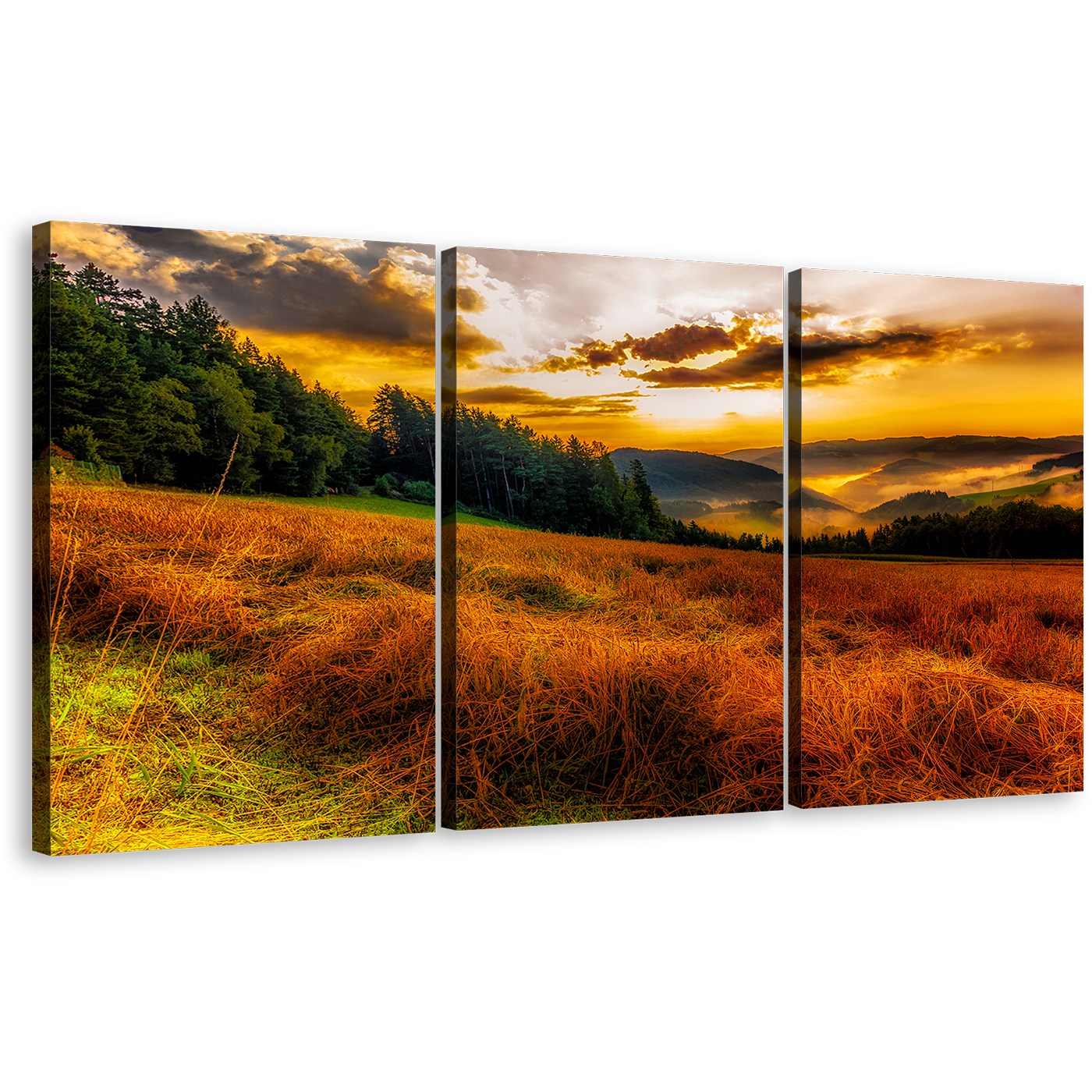 Misty Landscape Canvas Print, Green Trees Rural Landscape Multi Canvas, Yellow Sky Clouds Scenery Horizon 3 Piece Wall Art Canvas Print