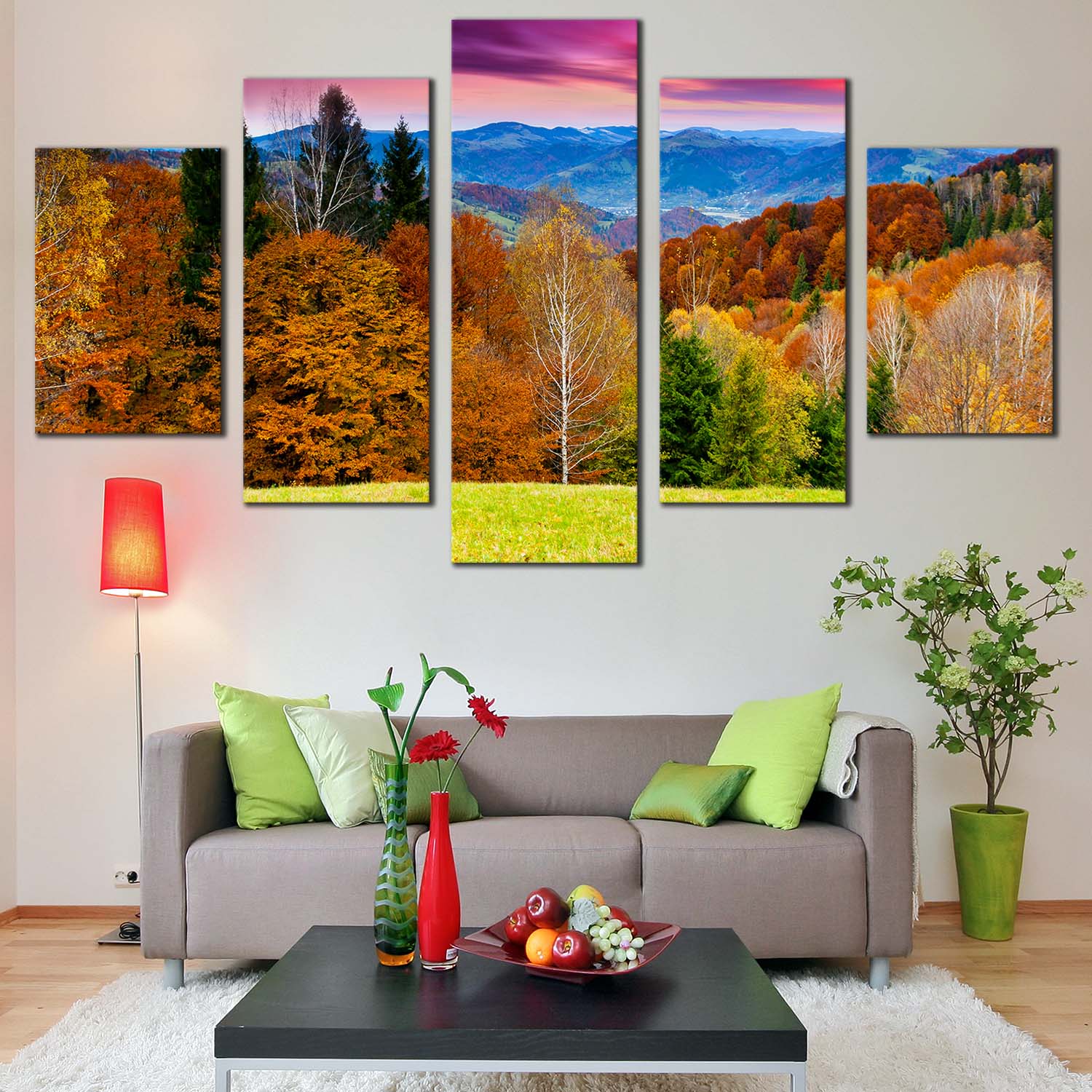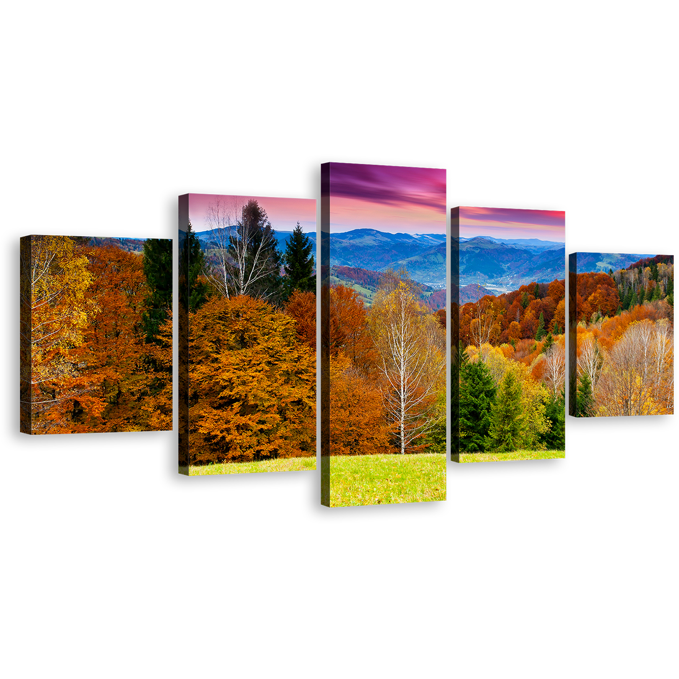 Mountain Landscape Wall Art, Orange Trees Nature Scenery Canvas Set, Dramatic Purple Sky Landscape 5 Piece Multi Canvas Canvas Print