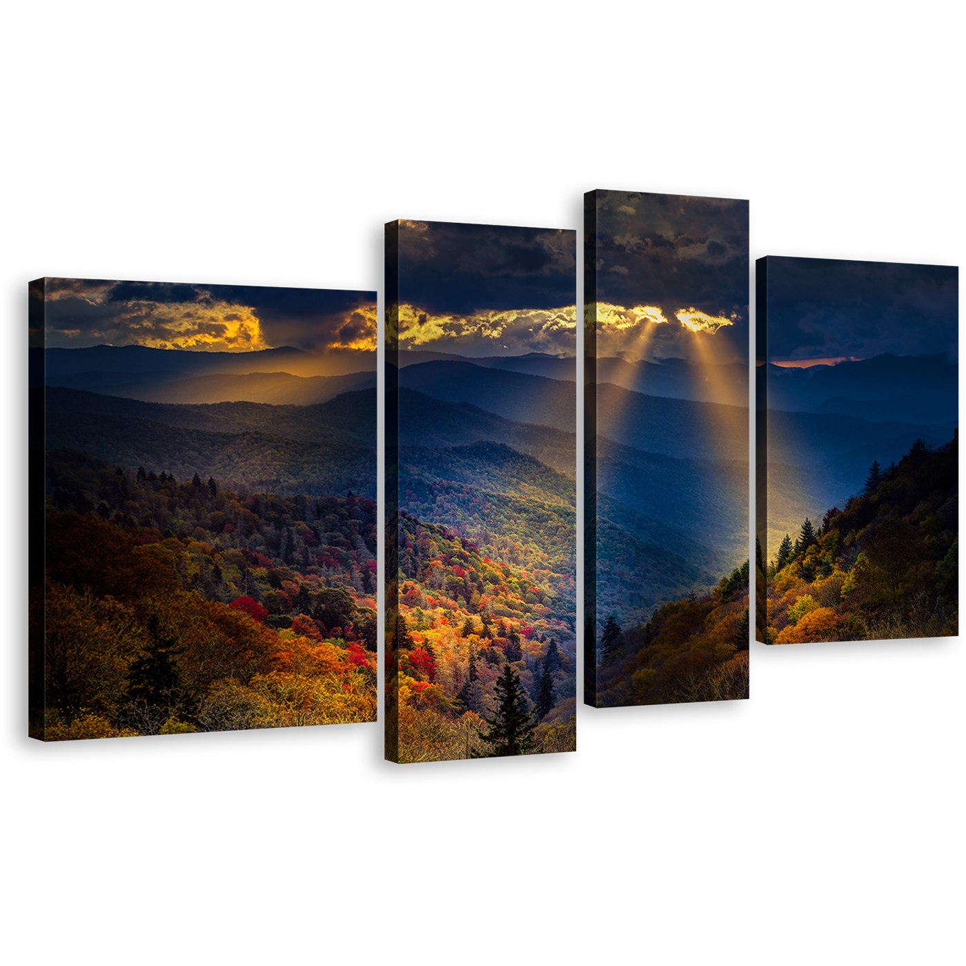 Mountain Scenery Wall Art, Yellow Sunbeams Cloudy Sky 4 Piece Canvas Print, Blue Smoky Trees Landscape Multi Canvas Canvas Print