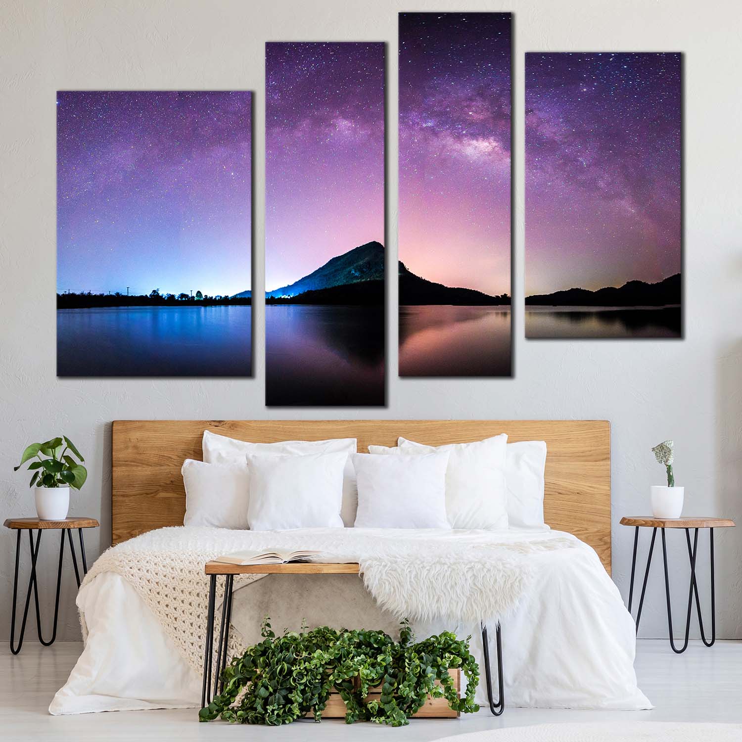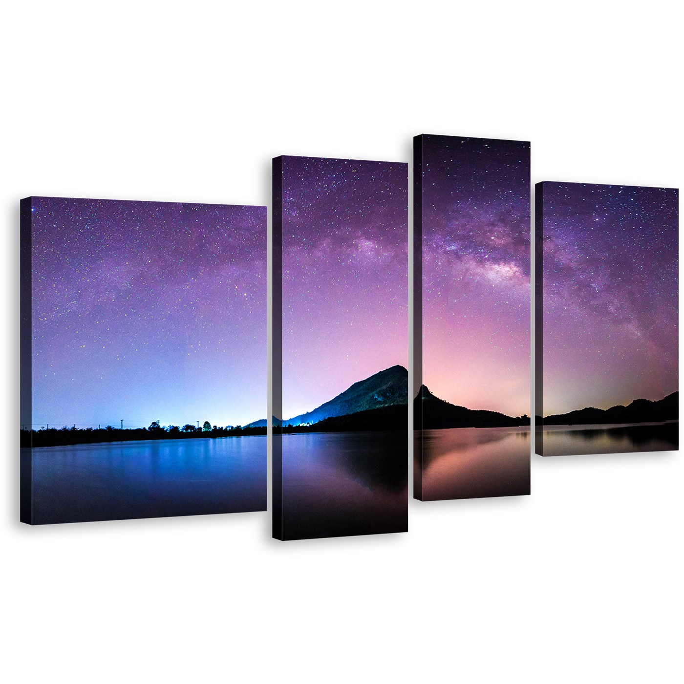 Mountain Sea Canvas Wall Art, Landscape Mountain Milkyway 4 Piece Canvas Print, Thailand Blue Purple Night Galaxy Multiple Canvas Canvas Print