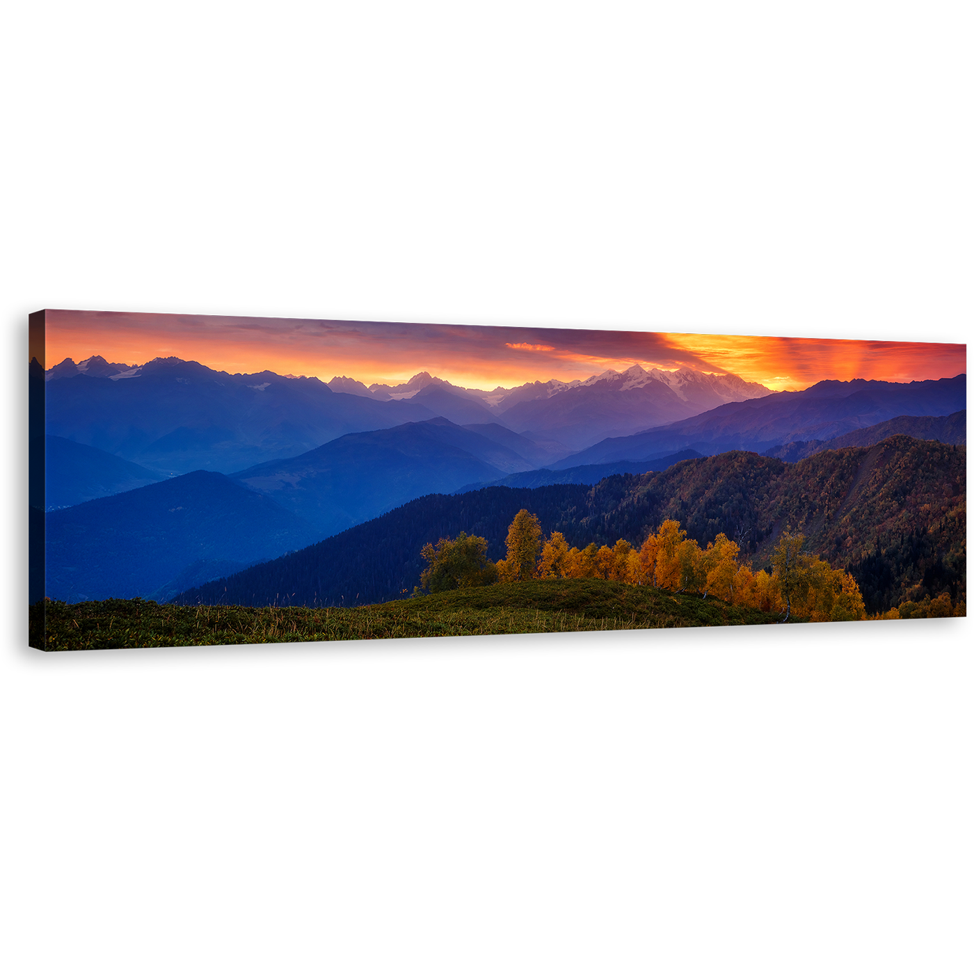 Mt Ushba Canvas Print, Dramatic Orange Sunbeams Sky Panoramic Canvas Wall Art, Mestia Georgia Blue Mountain Wide Canvas, Europe Caucasus Ridge Landscape Canvas Artwork Canvas Print