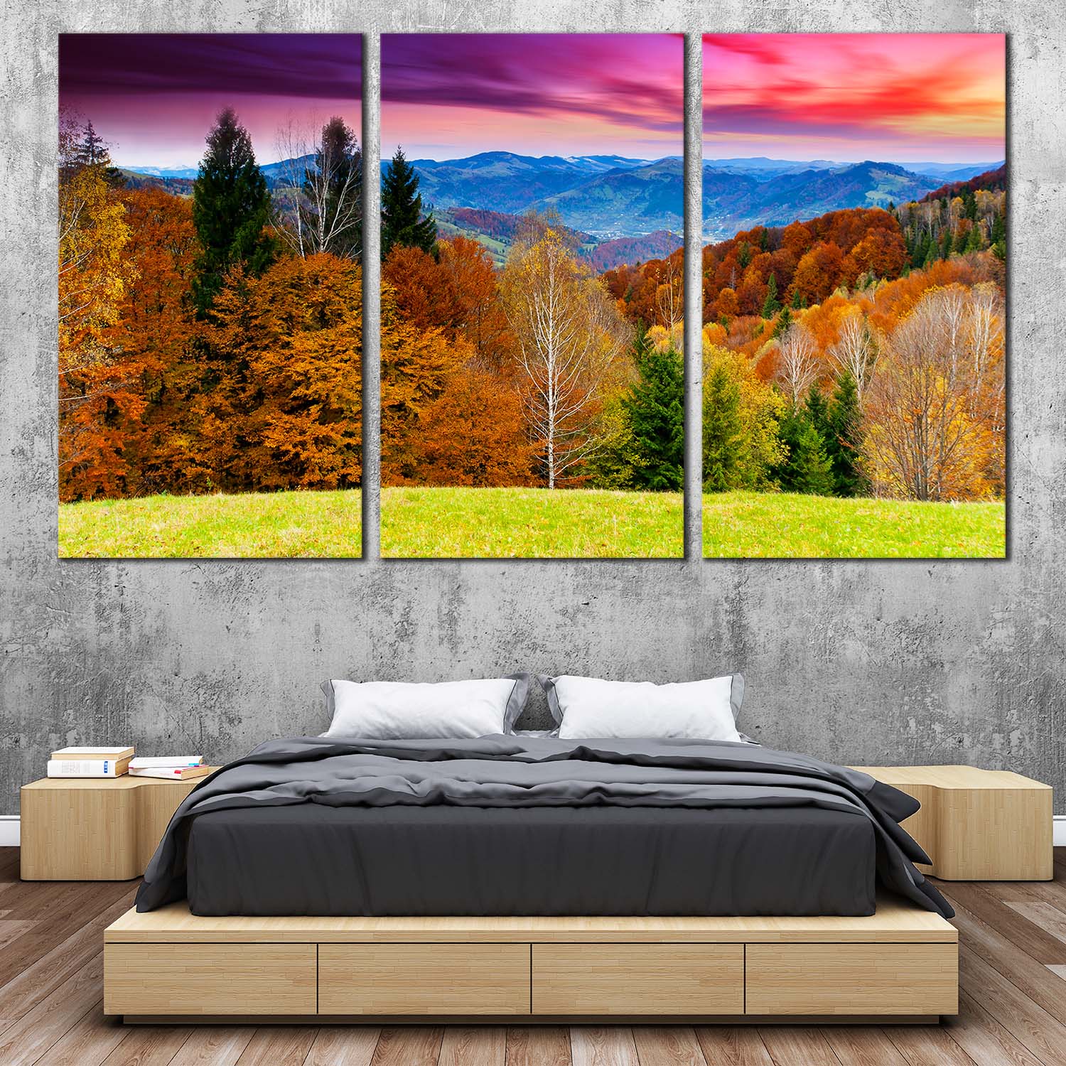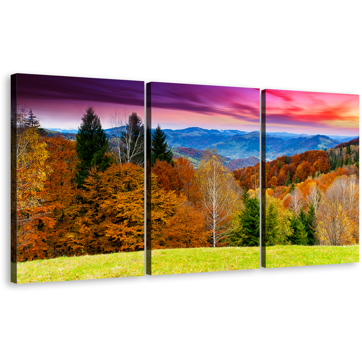Nature Scenery Canvas Print, Dramatic Purple Cloudy Sky Landscape 3 Piece Multi Canvas, Beautiful Blue Mountains Trees Wall Art Canvas Print