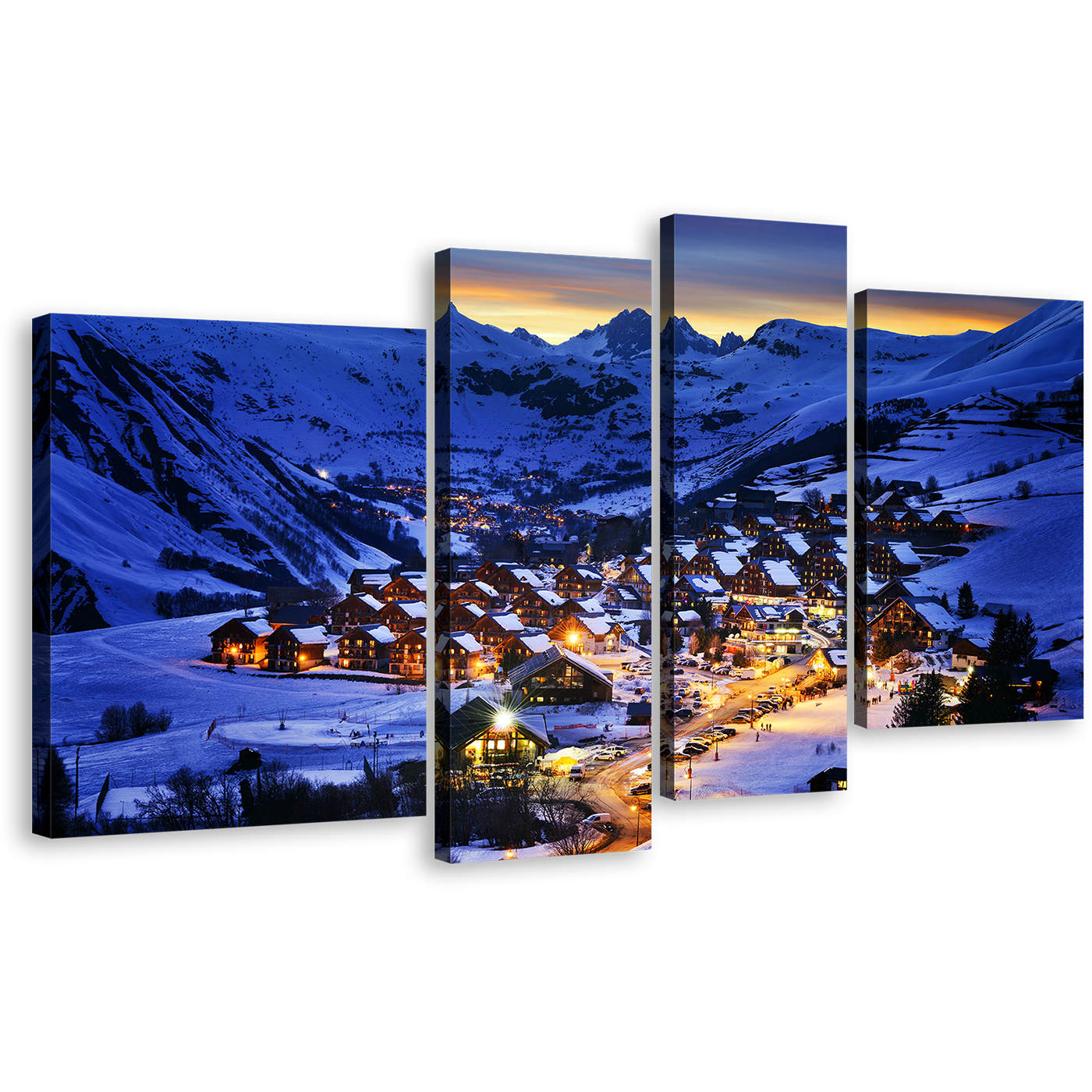 Ski Resort Canvas Wall Art, France Evening Blue Landscape Multi Canvas Artwork, Yellow Lights Snow Mountain Cabins 4 Piece Canvas Print Canvas Print