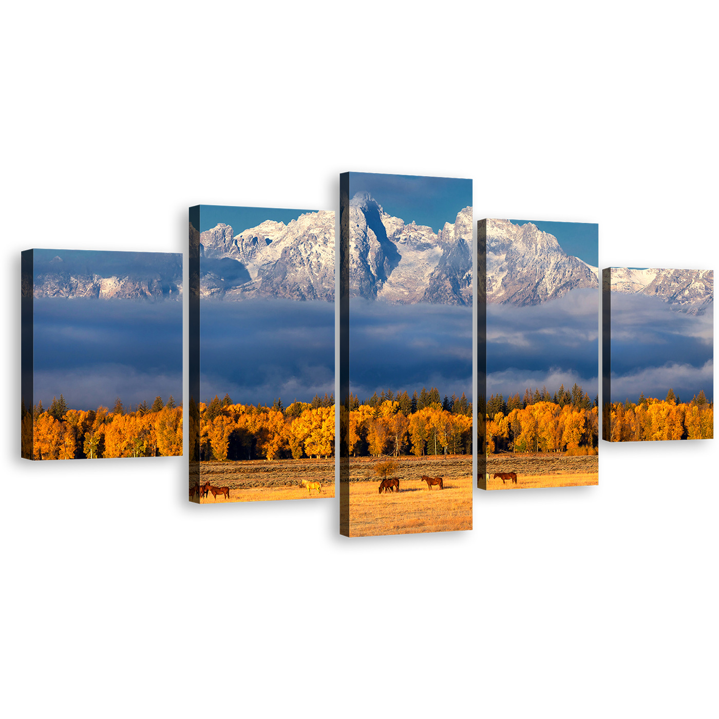 Snow Mountains Canvas Print, Orange Autumn Landscape Multi Canvas, Blue Cloudy Sky Canvas Set, Grand Tetons Range 5 Piece Canvas Wall Art Canvas Print
