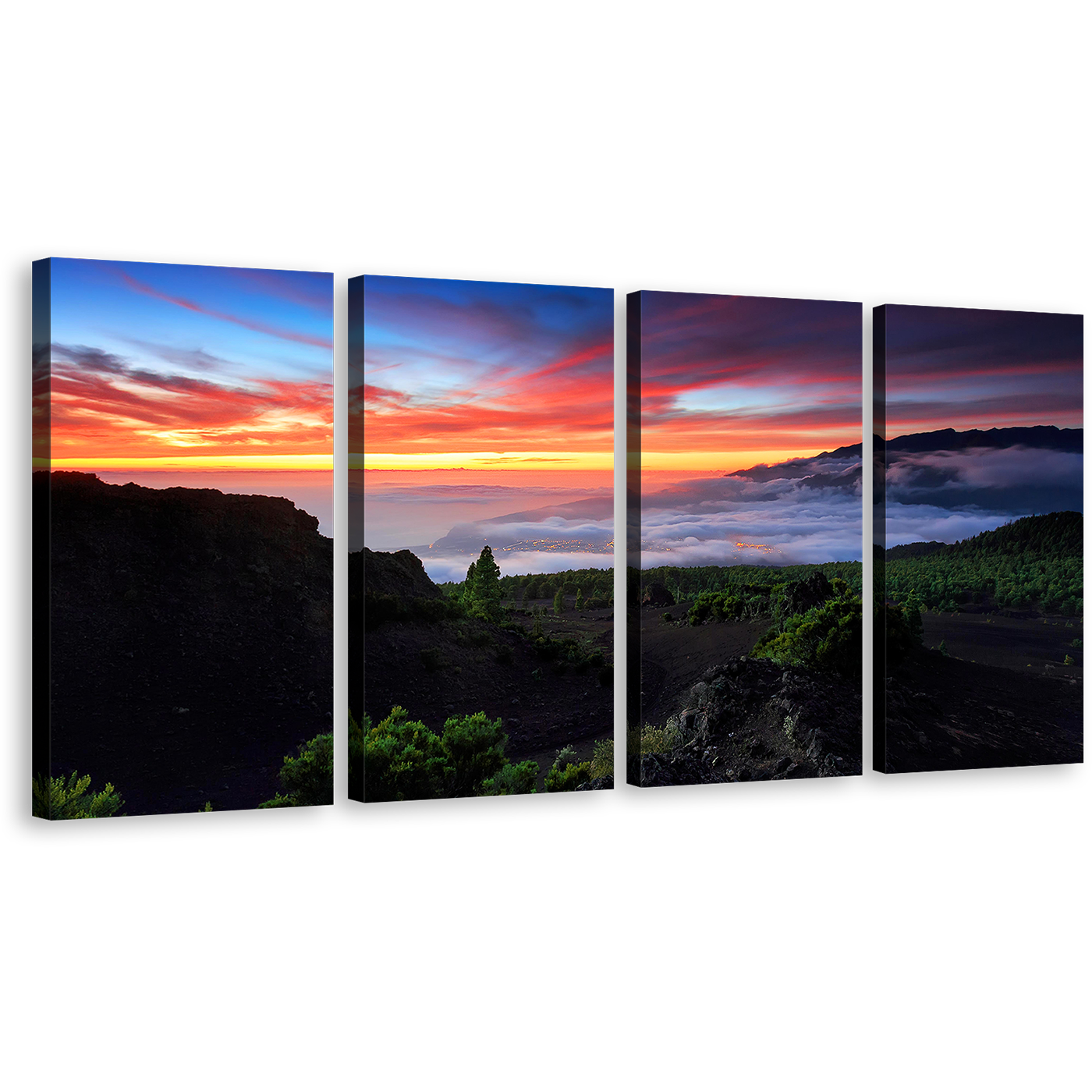 Spain Landscape Canvas Wall Art, Dramatic Red Yellow Sunset Mountains Multi Canvas, Europe Green La Palma Landscape 4 Piece Canvas Print Canvas Print