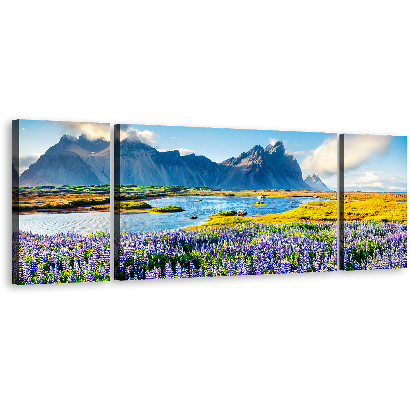 Stokksnes Headland Wall Art, Blue Batman Mountain Southeastern Icelandic Landscape 3 Piece Canvas, Purple Lupine Flowers Scenery Canvas Set Canvas Print