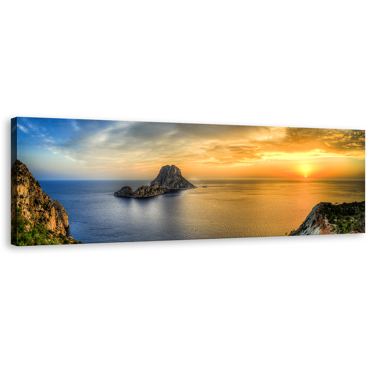 Es Vedra Canvas Print, Ibiza Island Yellow Sunset Canvas Wall Art, Ocean Mountain Blue Sky Sea Panorama Canvas Artwork Canvas Print