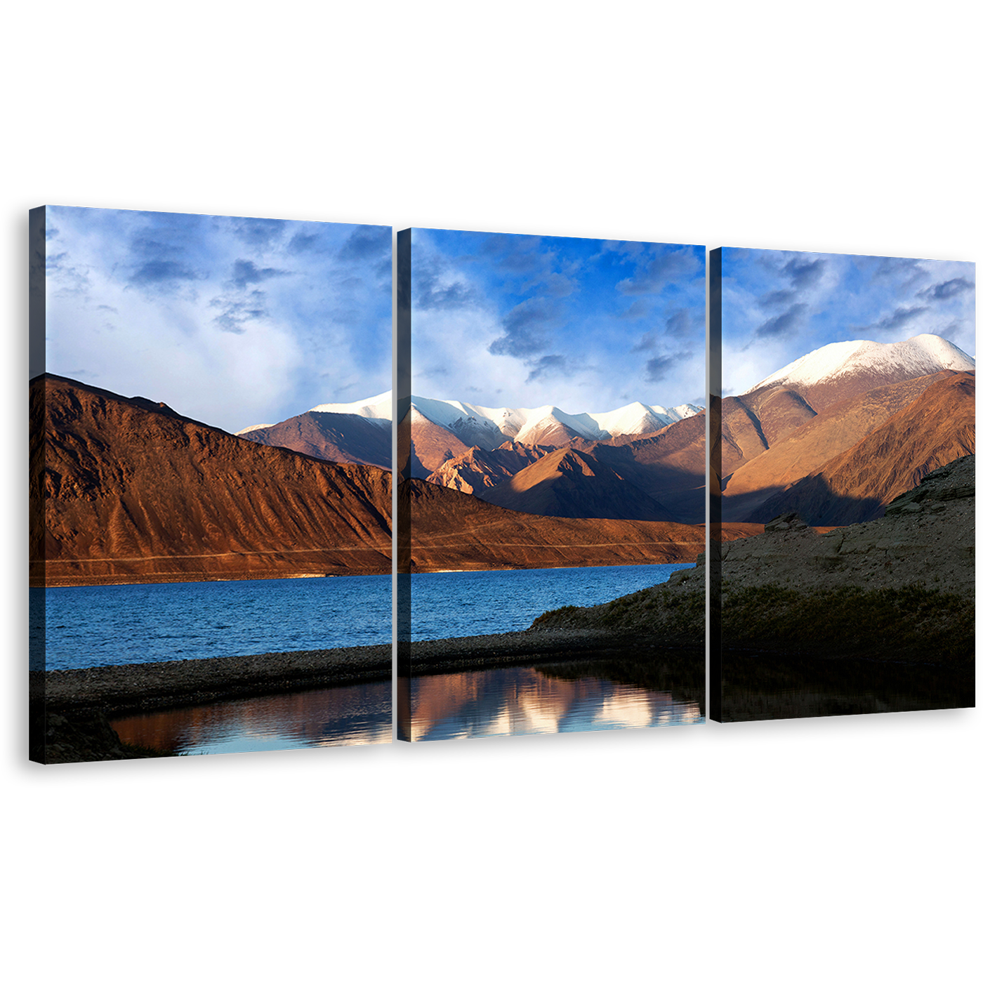 Tibet Pangong Wall Art, Pangong Tso Ocean Mountains Multi Canvas Artwork, Brown Blue Sky Lake 3 Piece Canvas Print Canvas Print