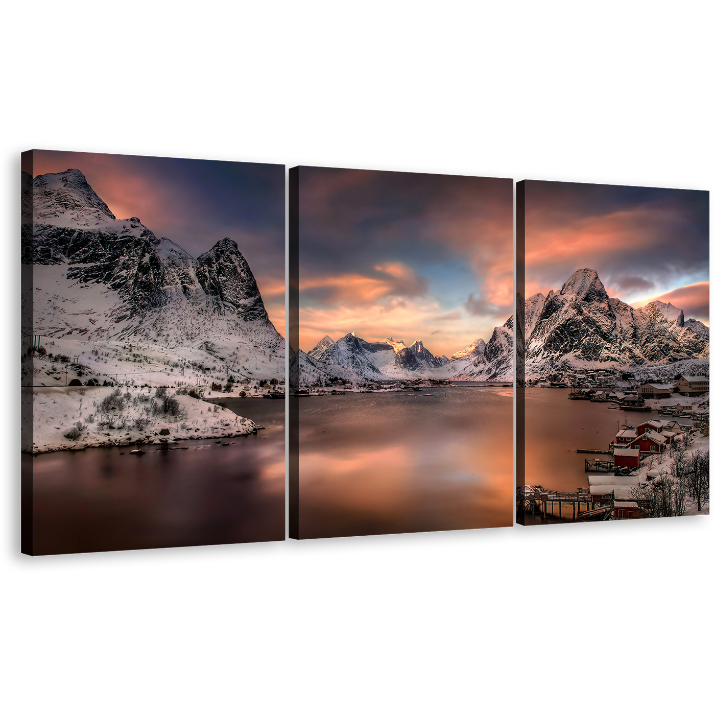 Lofoten Norway Wall Art, Cloudy Orange Sunset Reinevagen Mountains 3 Piece Canvas Print, Grey City Mountains Multi Canvas Canvas Print