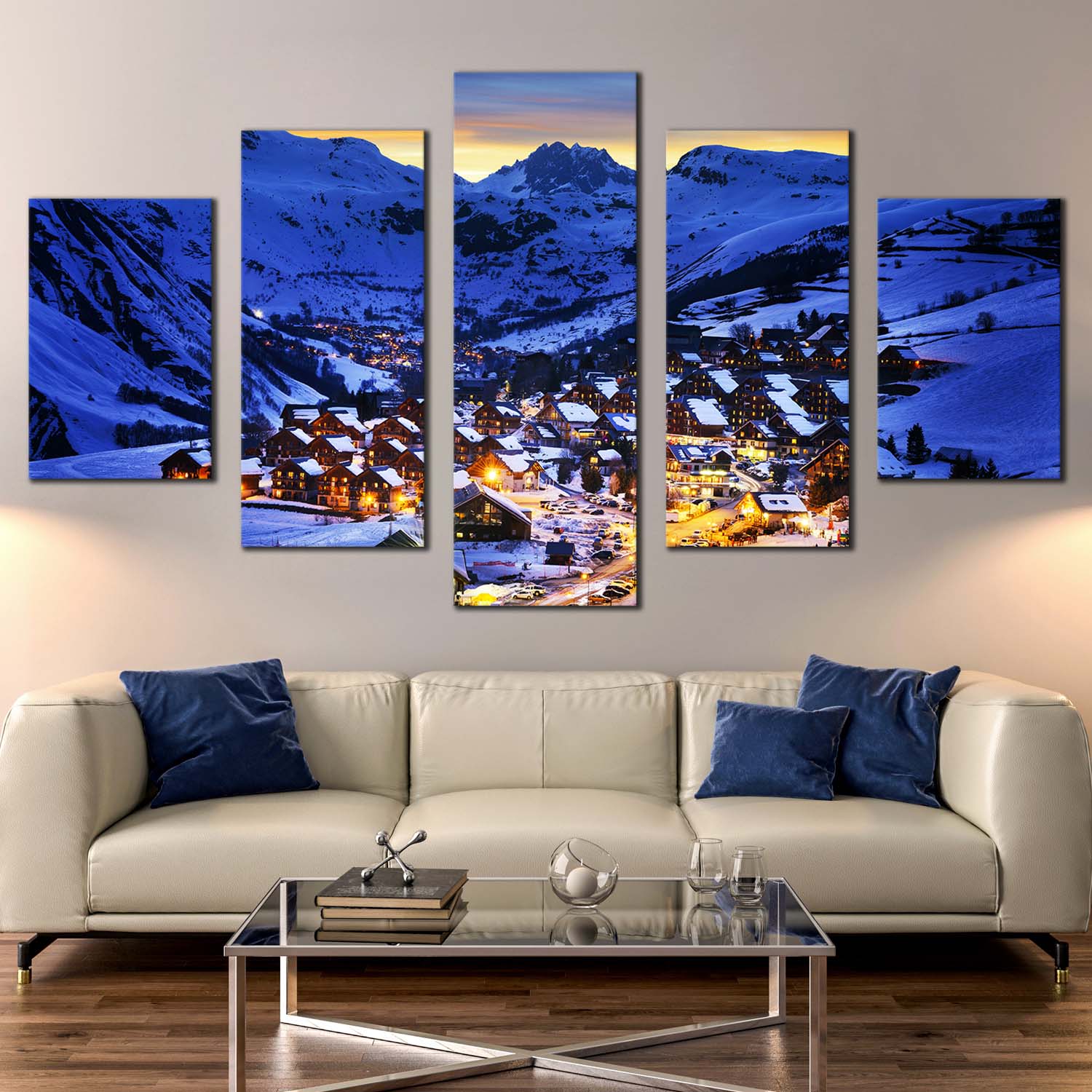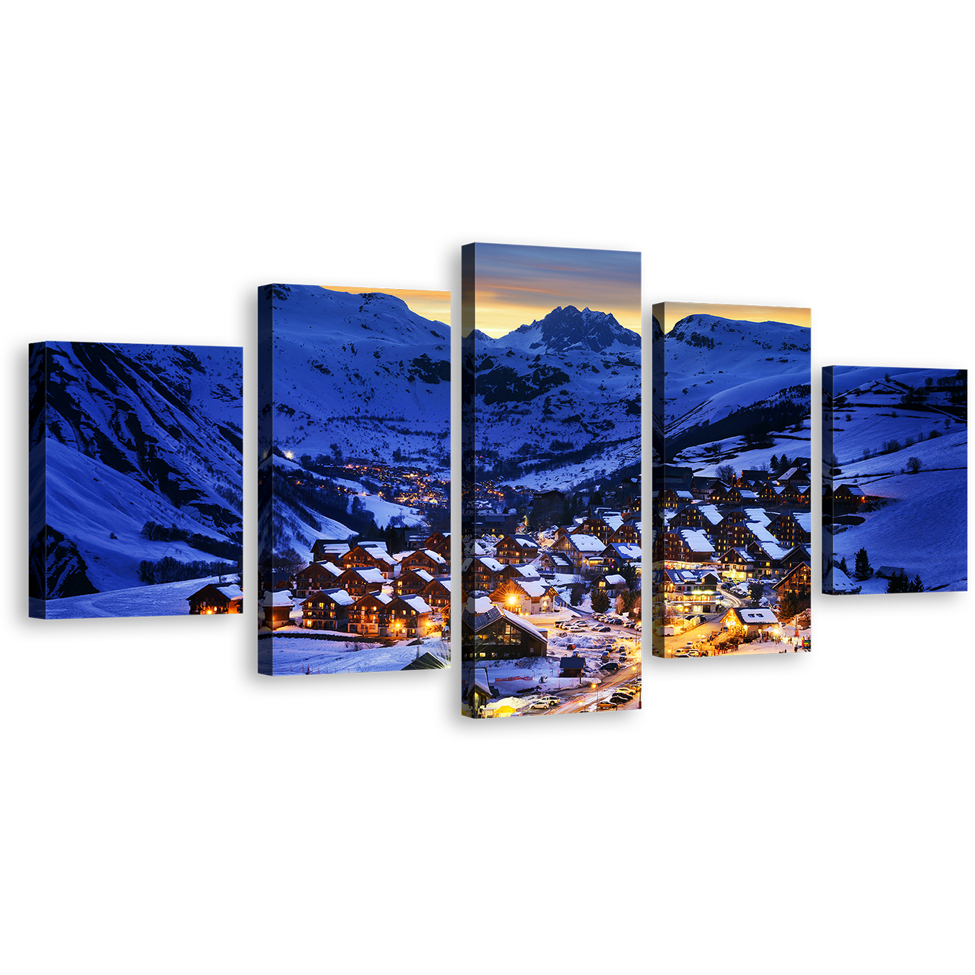 Winter Mountain Canvas Wall Art, Yellow Ski Resort Canvas Print, France Blue Evening Landscape 5 Piece Multiple Canvas Canvas Print