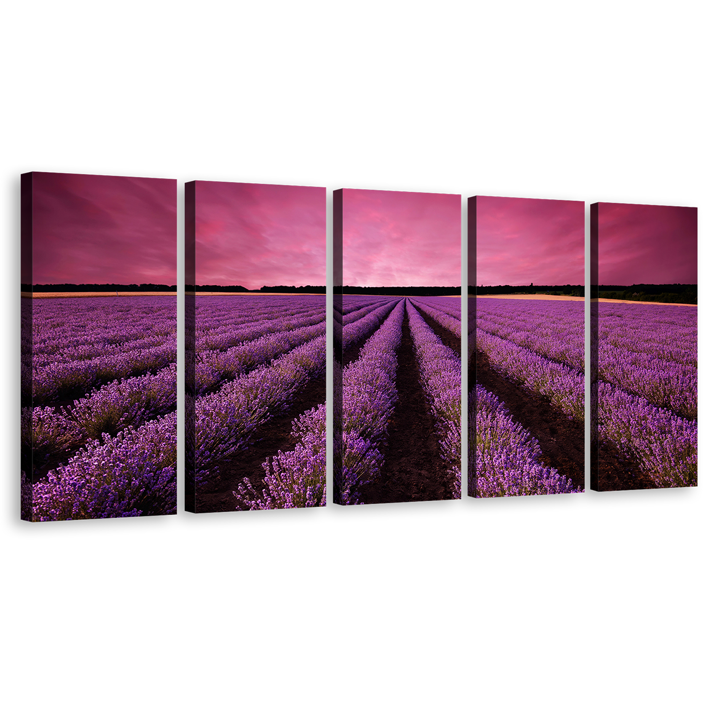Beautiful Fields Canvas Print, Black Valensole Plateau Landscape Canvas Set, Purple Lavender Fields Scenery 5 Piece Canvas Wall Art Canvas Print
