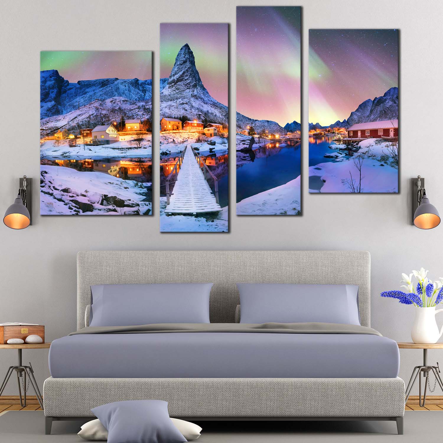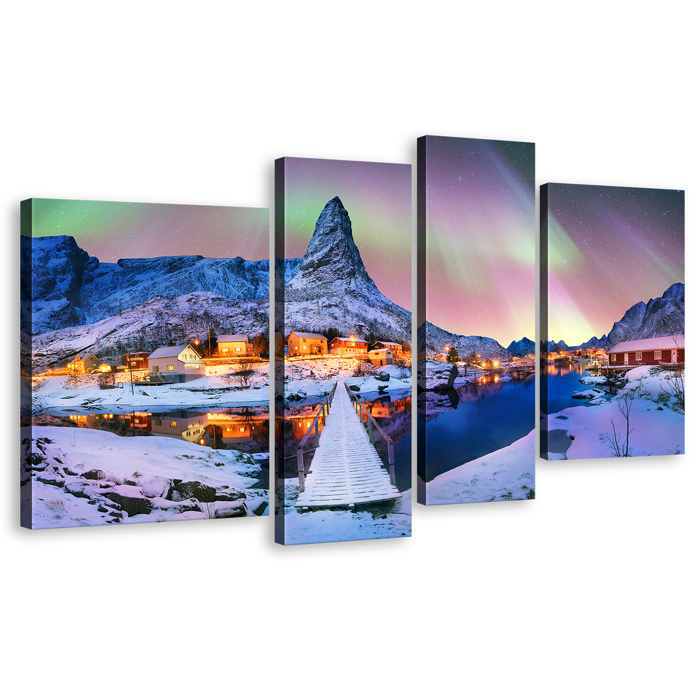 Enchanted Lofoten Canvas Print, Lofoten Island's Snowy Peaks under Blue Green Aurora Borealis 4 Piece Canvas Wall Art Canvas Print