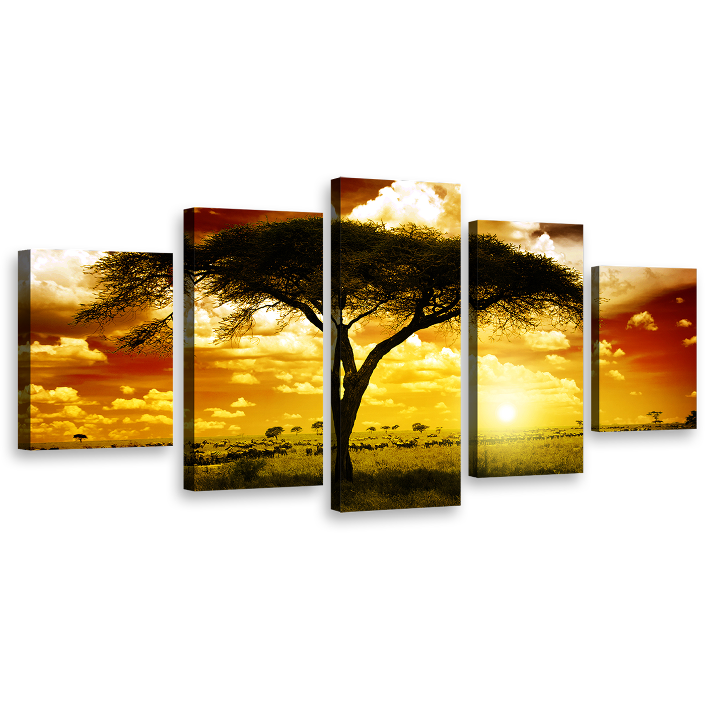 African Sunset Wall Art, Beautiful Brown Yellow Cloudy Sky Canvas Set, Majestic Alone Tree 5 Piece Canvas Multi-panel Print Canvas Print