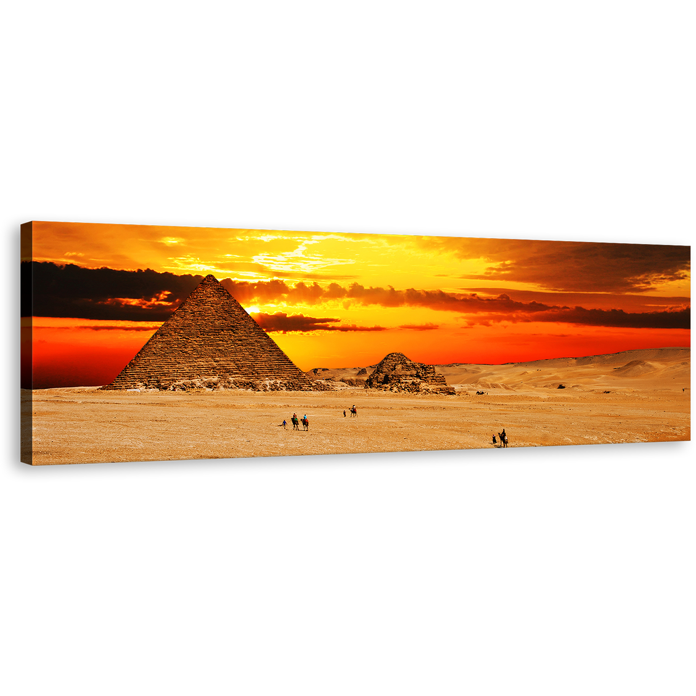 Giza Necropolis Canvas Wall Art, Egypt Brown Camel Desert Wide Canvas, Yellow Cloudy Sunset Sky Pyramid 1 Piece Canvas Print Canvas Print