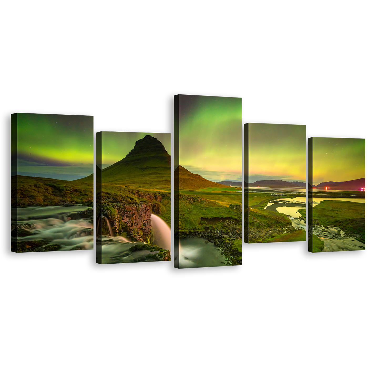 Northern Lights Canvas Wall Art, Yellow Green Sky Mountain River Waterfall Canvas Print, Kirkjufell Mountain 5 Piece Canvas Canvas Print