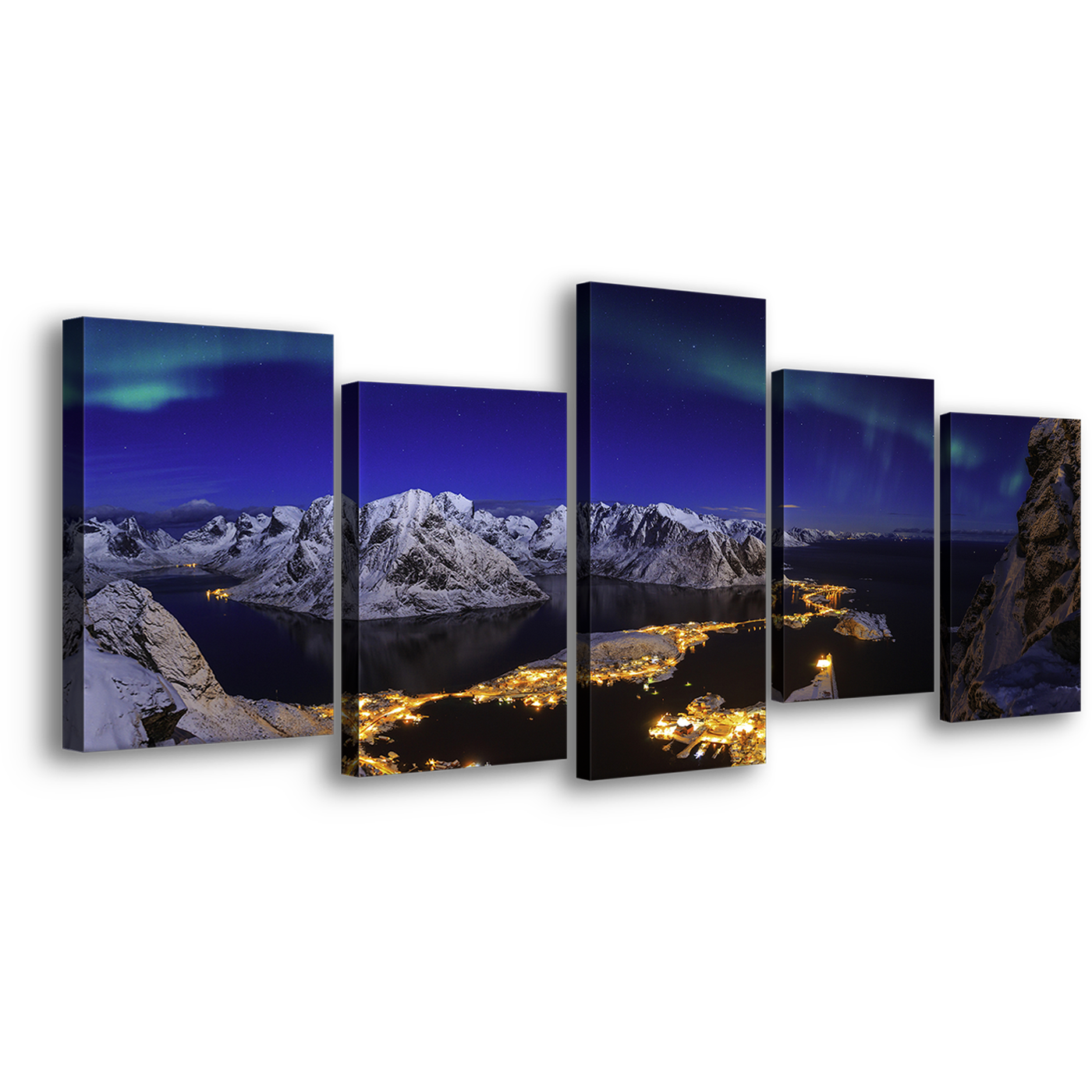 Northern Lights Canvas Wall Art, Blue Sky Aurora Seascape 5 Piece Canvas Print, White Snowy Mountain Village Multi Panel Canvas Canvas Print