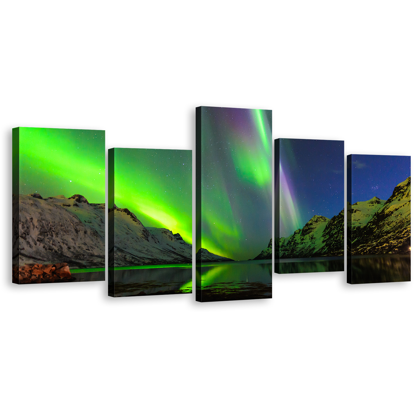 Northern Lights Canvas Wall Art, Dramatic Blue Starry Sky 5 Piece Canvas, Green Ersfjord Norway Aurora Canvas Print Canvas Print