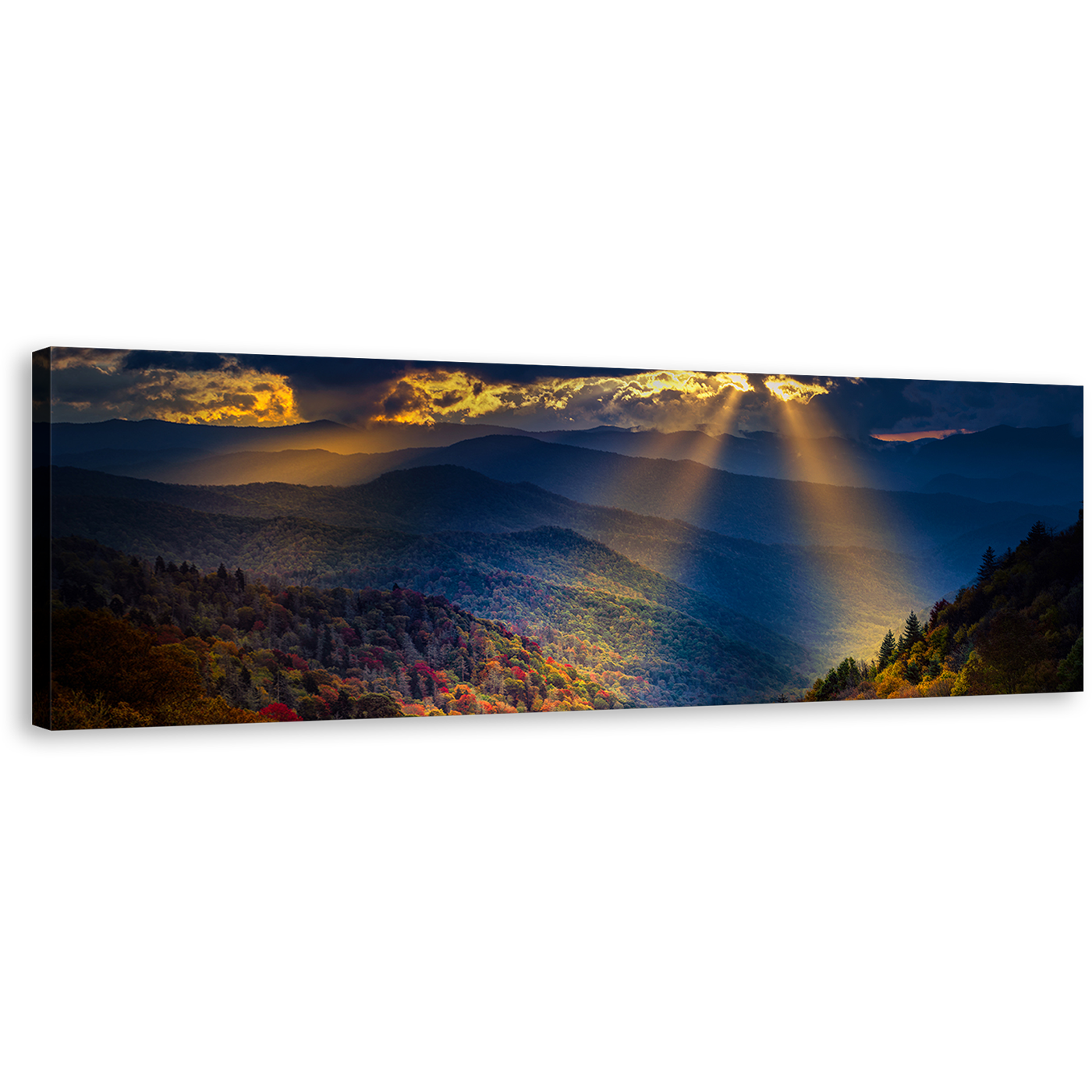 Smoky Mountains Wall Art, Yellow Sunbeams Mountains Scenery Canvas Print, Blue Cloudy Sky Landscape Trees 1 Piece Canvas Art Canvas Print