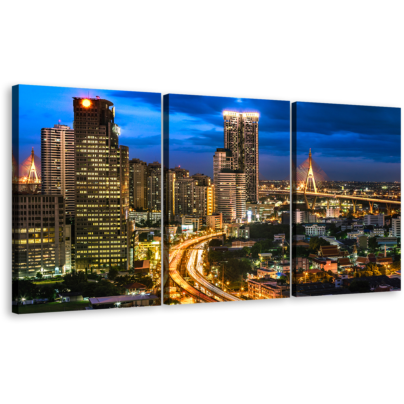 Thailand City Canvas Wall Art, Blue Sky City Lights Triptych Multiple Canvas, Bangkok Brown City Night View 3 Piece Canvas Print Canvas Print